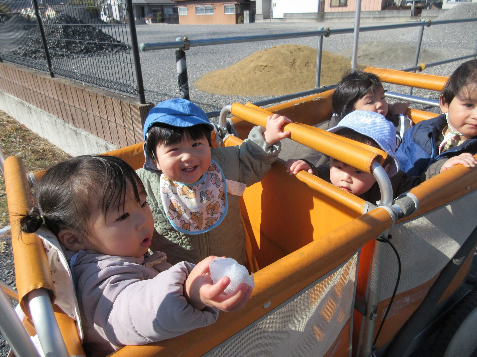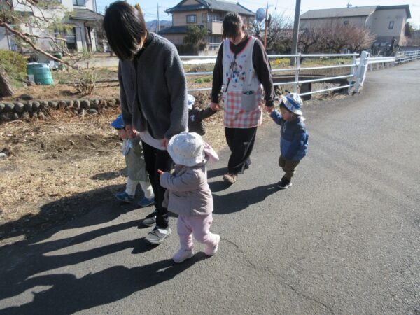園の周りを散歩しました。残っている雪に触ってみたり、時々吹く風に目を細めながら、冬の季節を感じることができました。歩くことが好きな子どもたちは、自分で靴を持ってくるなどして嬉しそうにしていました。