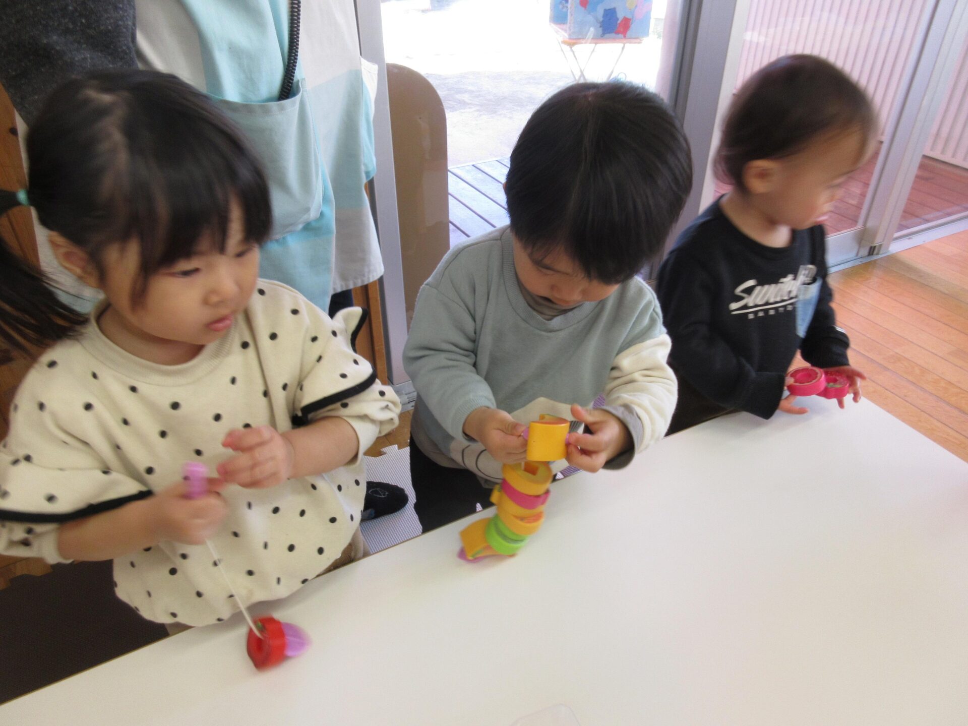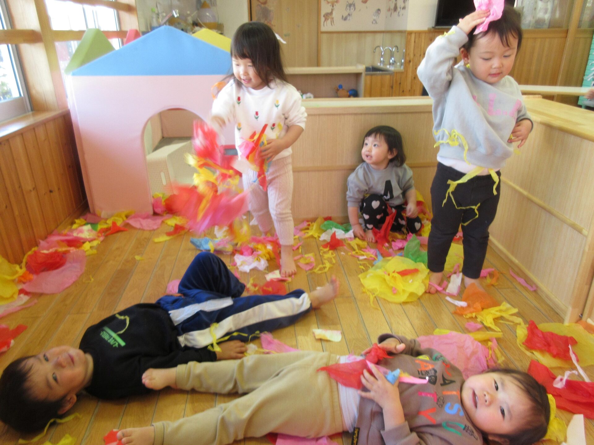 室内では、紐通しをして遊びました。穴をよく見ながら、集中して通そうとしていました。お花紙コーナーでは、ビリビリと破って遊ぶと、みんなで上にふわーっと舞い上げて大喜び!ひらひらと落ちてくる様子を見て笑ったり、その上にゴロゴロと寝転んだりしながら、全身で楽しんでいました。