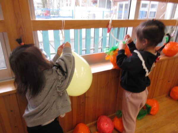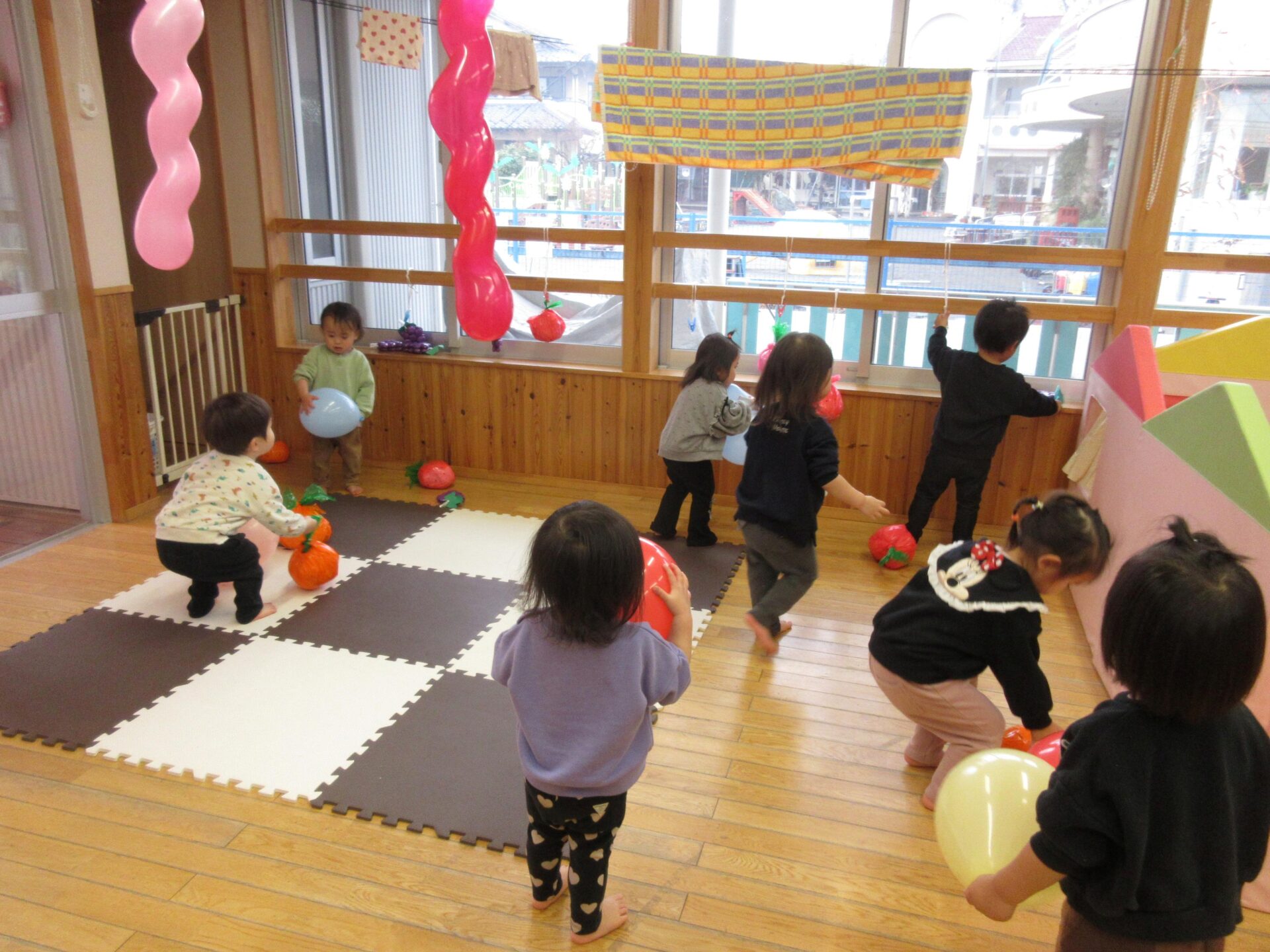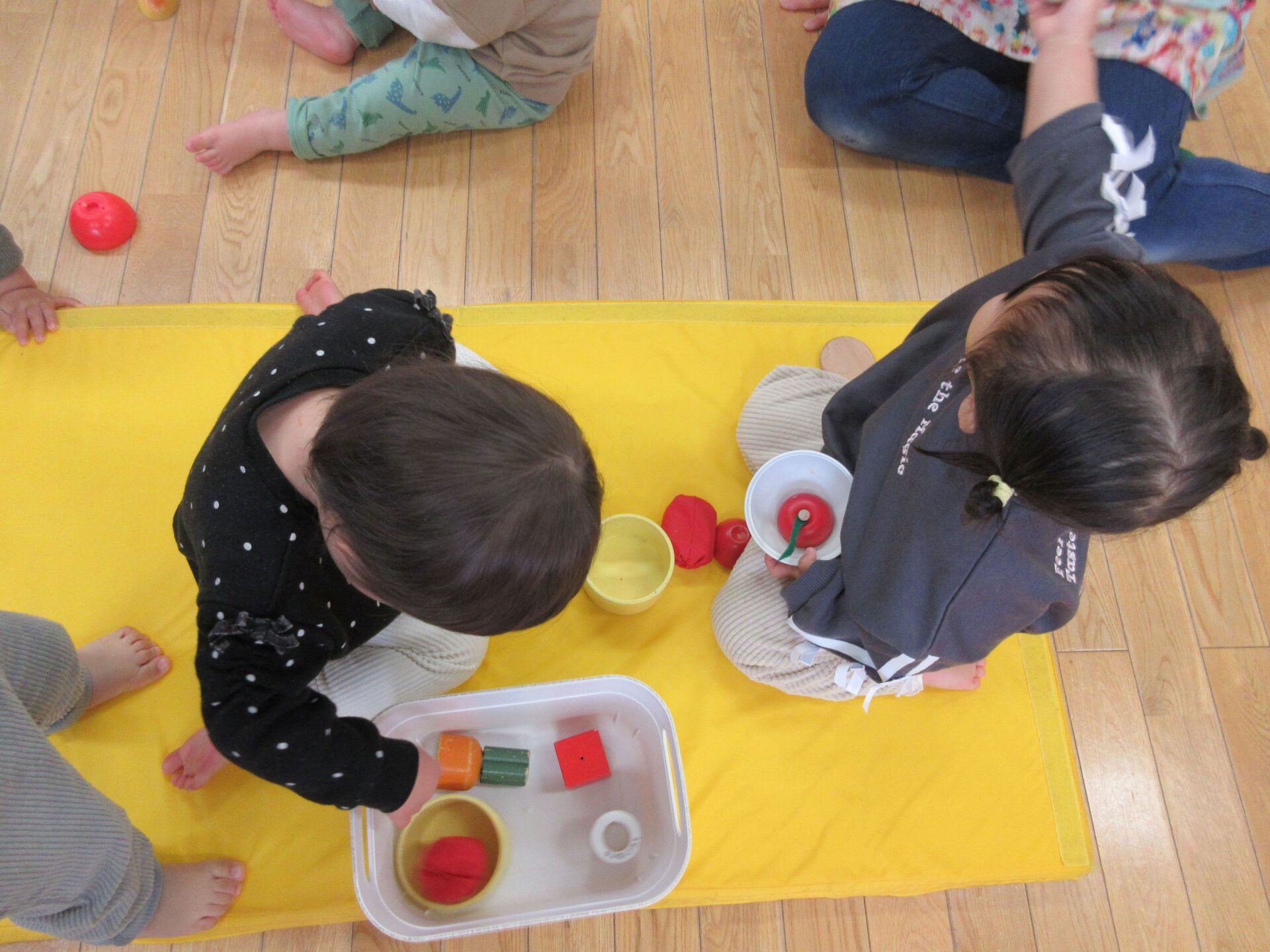 *1組 マットの上でピクニックが行われていました。ままごとの道具や食べ物を持ち寄り、食べる真似をしたり、作る真似をしたり楽しそうな姿がありました。 *2組 室内では風船で体を動かして遊んだり、手作りの果物で遊んだりしていました。洗濯バサミでぶら下げた手作りの果物を取ったりつけたりすることを楽しんでいました。指先を使って洗濯バサミをつまみ、繰り返し付け外しする姿が見られました。