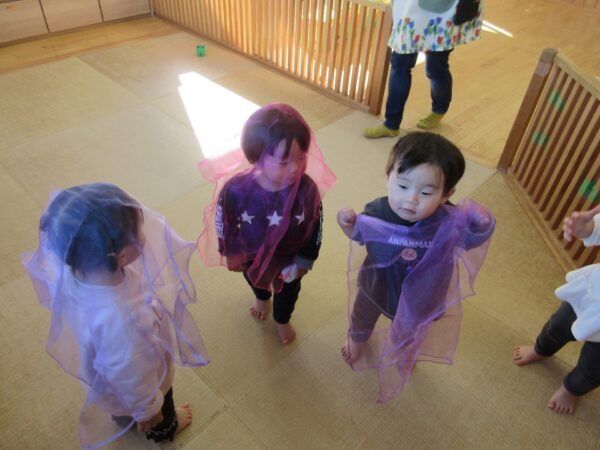オーガンジーの布で遊んでみました。頭からかぶって色がついた景色を喜んだり、「いないいないばあ!」としたり、ヒラヒラとさせてみたりしながら、様々に遊ぶことを楽しんでいました。