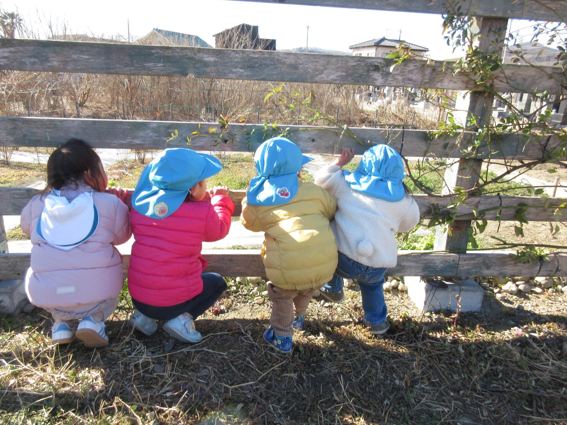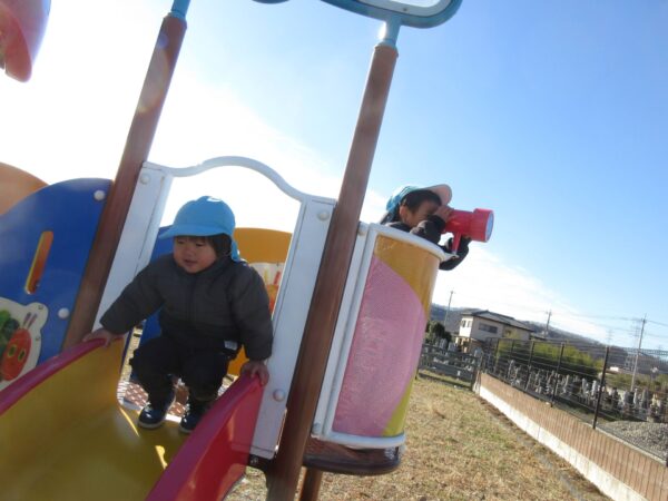 はらっぱワールドで遊びました。はらぺこあおむしの遊具にある望遠鏡を覗いてみたり、滑り台を何度も滑ったりしていました。畑で育てている野菜を、みんなで見ている姿もありました。野菜が大きくなっていくことが楽しみのようです。