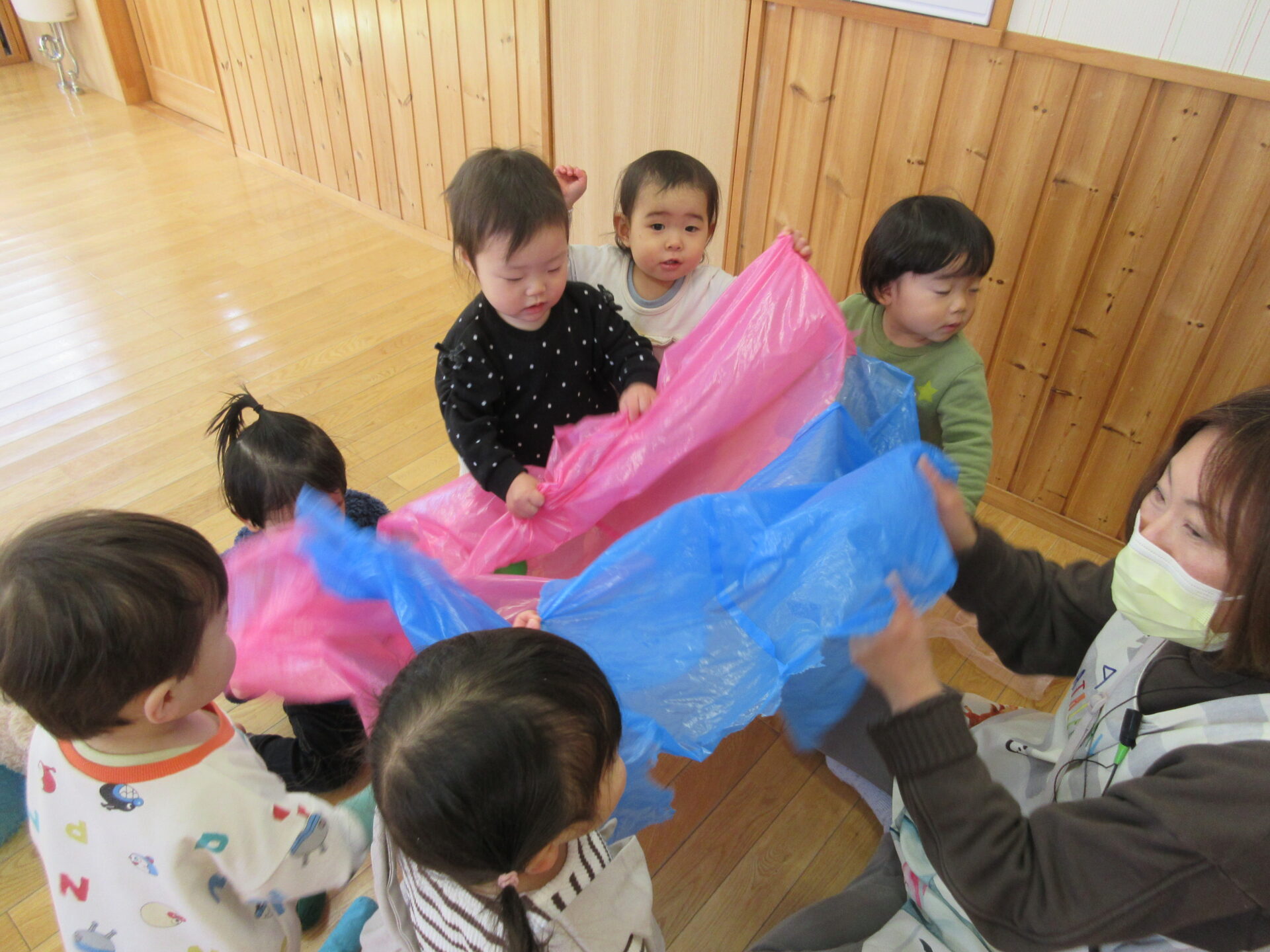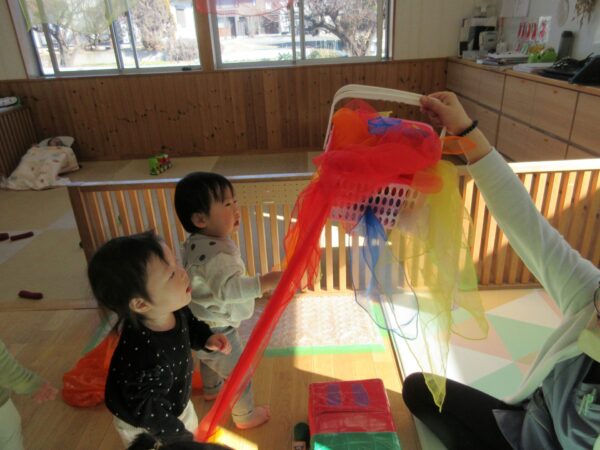 昨日に続き、オーガンジーの布やカラーポリ袋で遊びました。カラーポリ袋を大きくつなげてみると大喜びの子どもたち。保育者と一緒に持ってヒラヒラとさせたり、シャカシャカとする感触を味わっていました。オーガンジーの布をかごの中に入れると、隙間から引き出す遊びを面白がってやっている様子がありました。