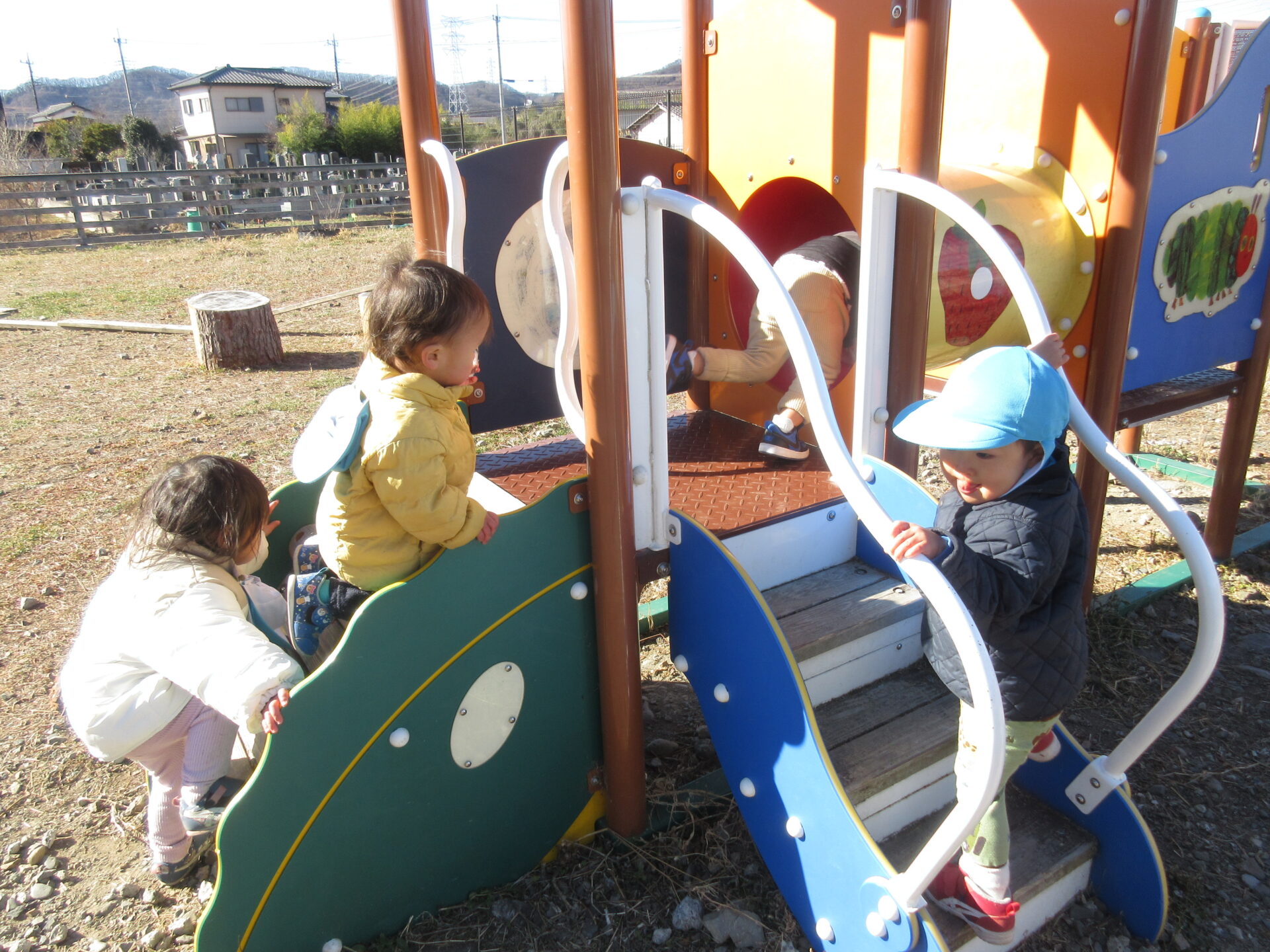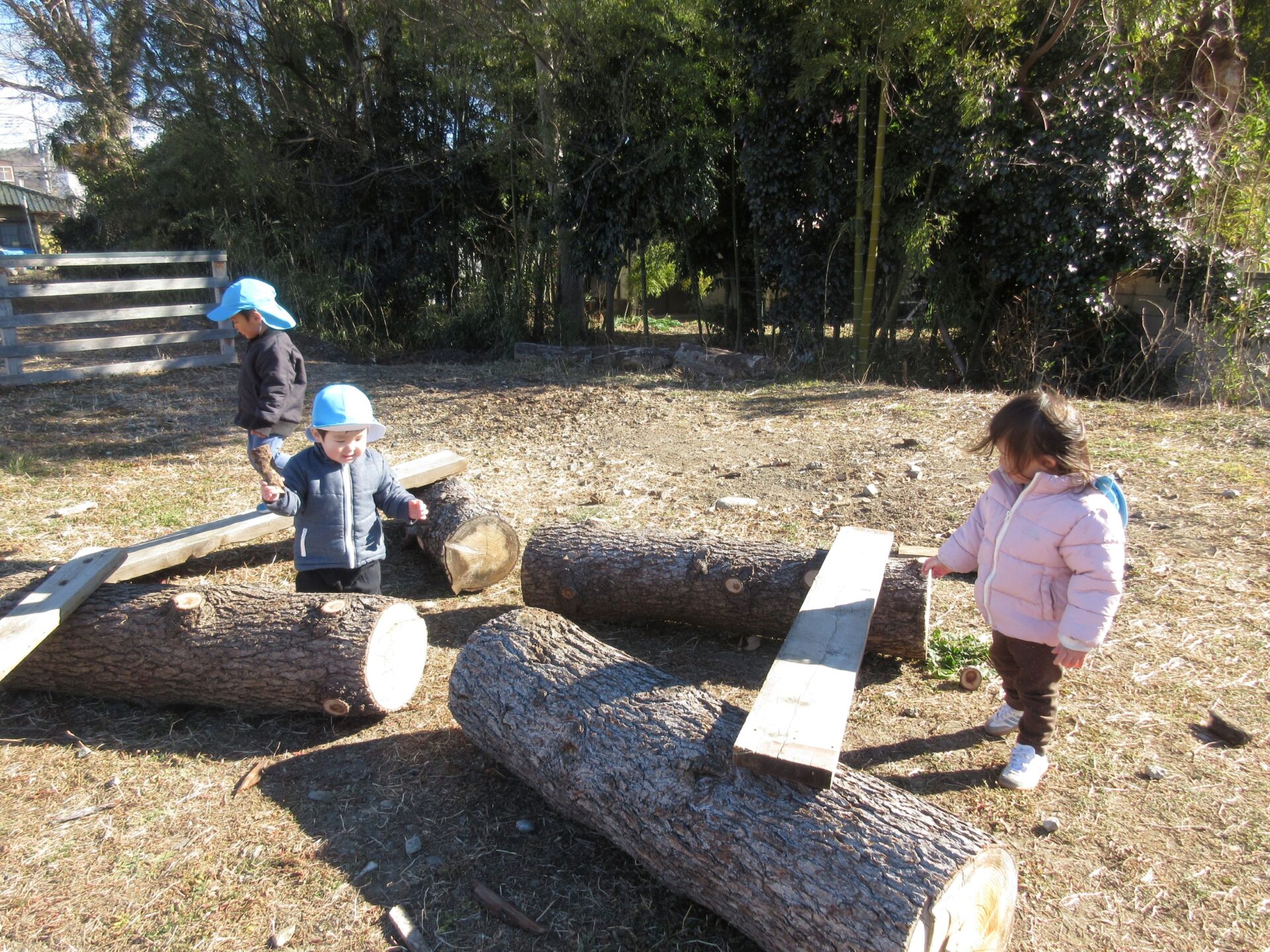 子育てガーデン広場へ行ってきました。はらぺこあおむしの遊具に積極的に登って遊んでいる様子や、板と丸太のアスレチックで存分に体を使って遊んでいる姿がありました。体を様々に使って遊ぶことが上手な子どもたちは、ジャンプをしたり、バランスとをりながら橋を渡ったり、と体を使うことを喜んでいました。