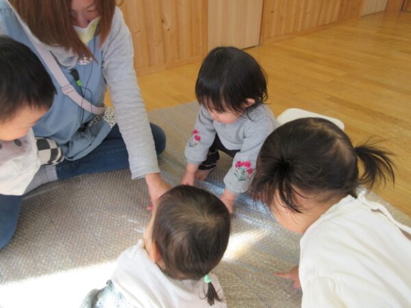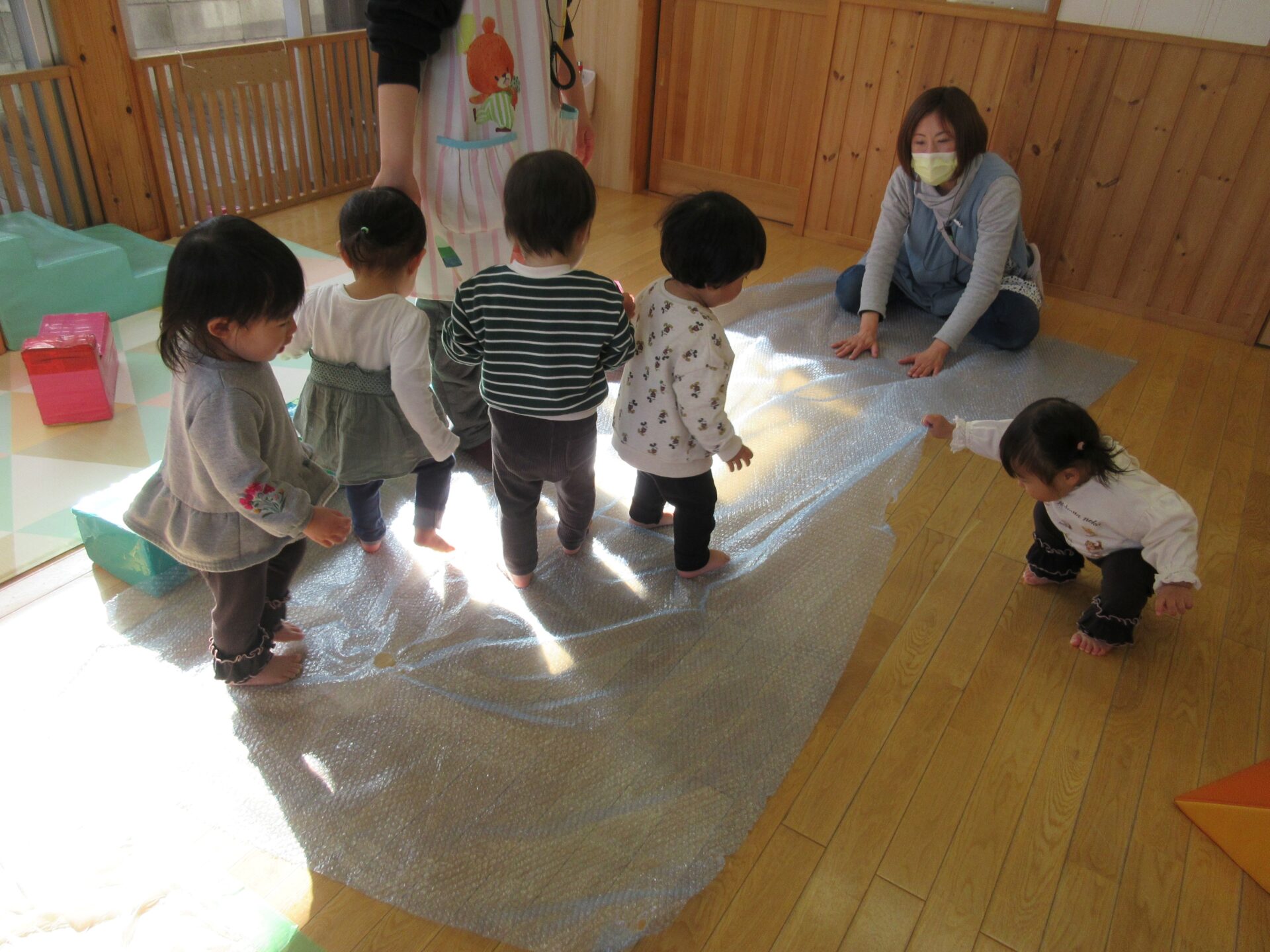 今日は大きなプチプチのシートを用意してみると、上に乗って足でプチプチの感触を味わってみたり、指でつついてプチプチをつぶそうとしていました。シートの上に寝転がってみたり、自分に巻いてみたりする姿もあり、プチプチの感触を全身で味わっていた子どもたちです。