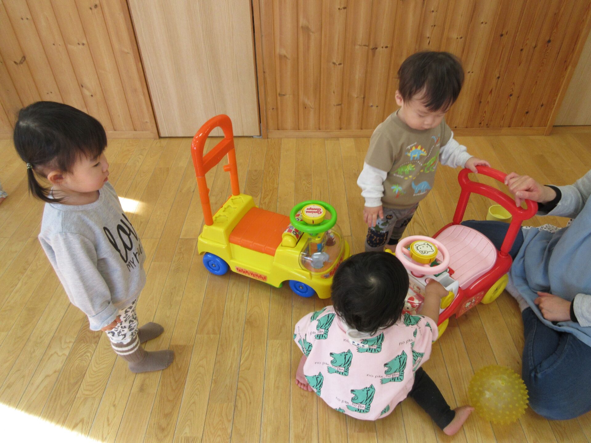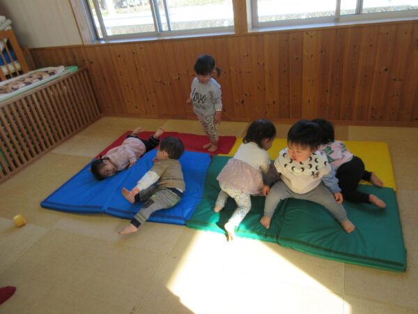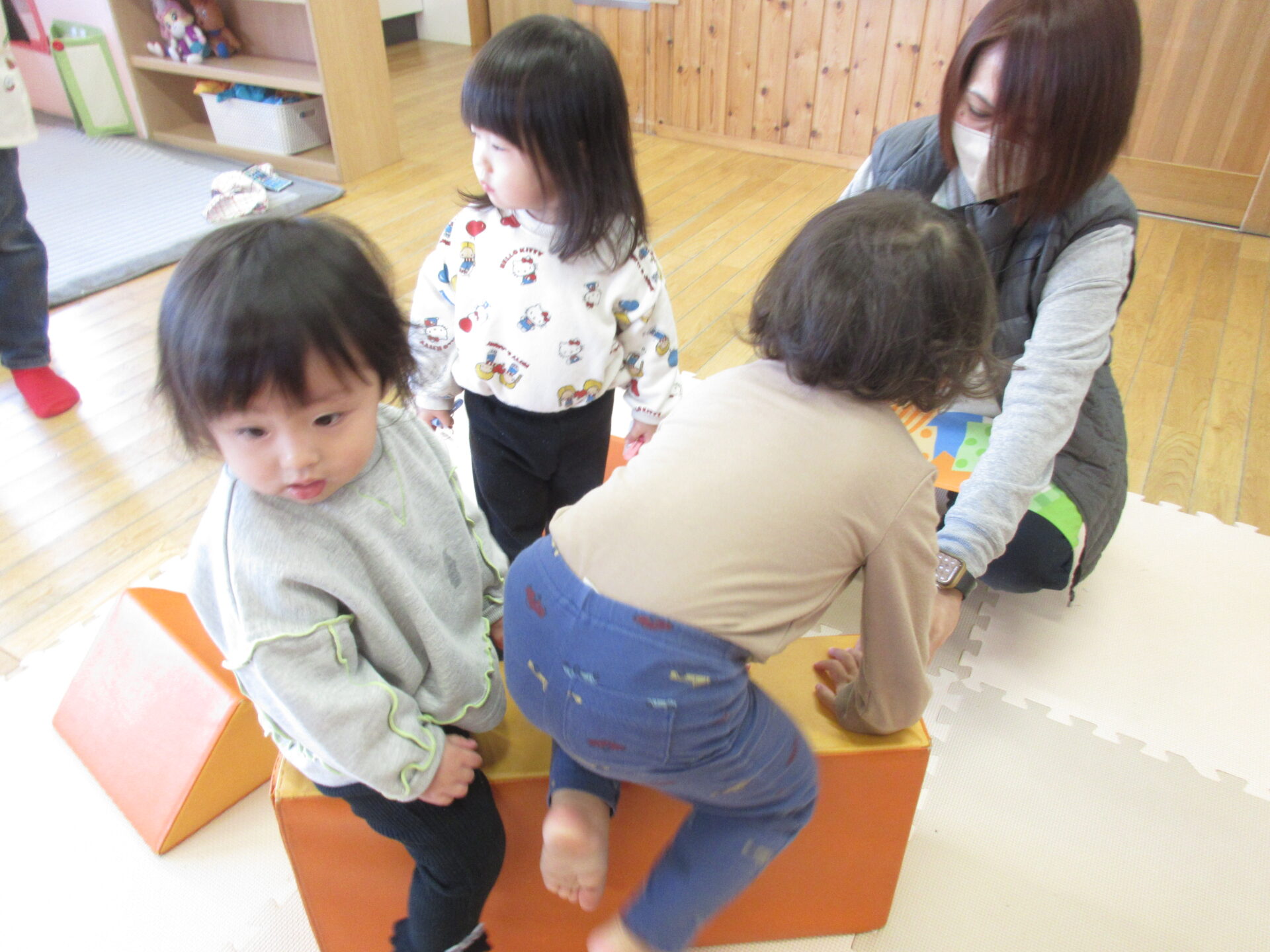 室内でゆったりと過ごせるようにしました。年末からよく遊んでいる乗り物やマットを用意し、安心して遊べるようにしましたよ。元気いっぱいな子どもたちは、乗り物に乗って室内を行き来したり、マットに嬉しそうに寝転がったり、山を登ったりしていました。