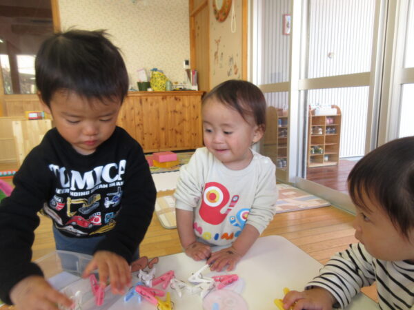 久しぶりの登園、お部屋で洗濯ばさみ遊びや身体を動かせるコーナーで遊んで過ごしました。お友だちと先生と一緒にニコニコと遊ぶ姿や、洗濯ばさみ遊びに夢中になって真剣な表情の姿がありました。