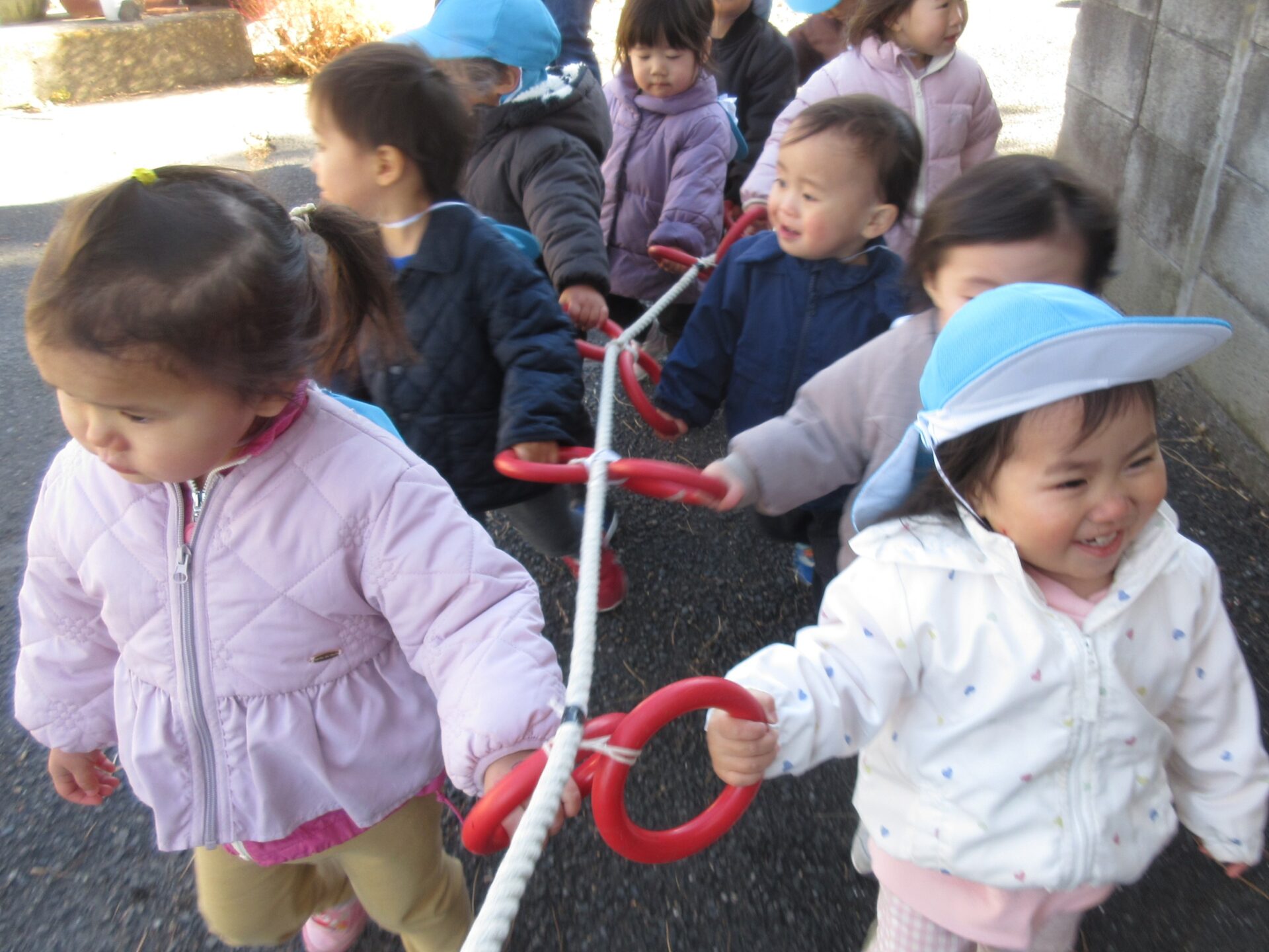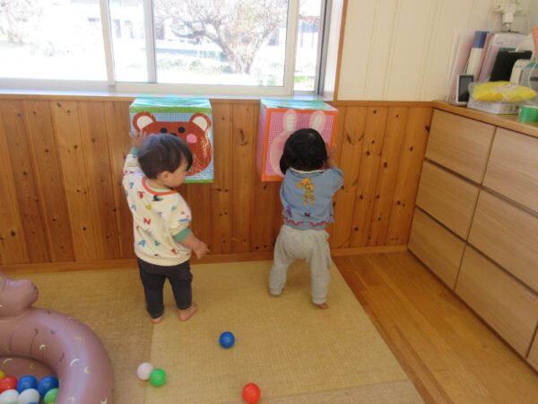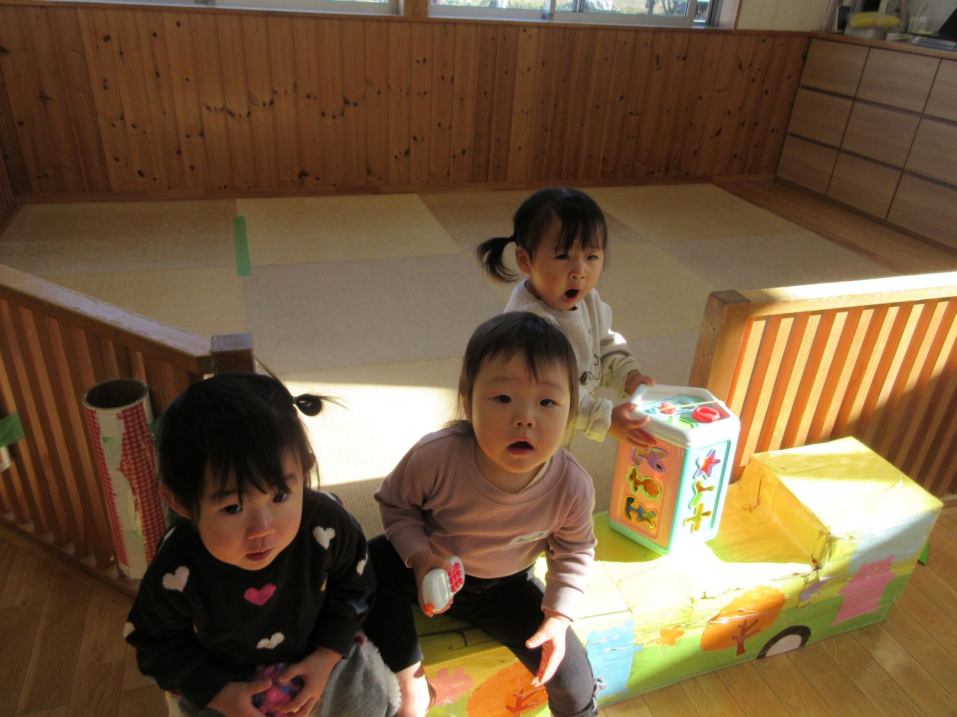 *1組 ボールを見つけたお友だちが、「遊びたい!!」というように指をさして訴えてくれました。ボールで遊べるように用意をすると、嬉しそうにボールプールに入ったり、ボールを投げたりしていました。 *2組 今日は園の周りにお散歩をしに行きました。風が吹く度に嬉しそうな表情で先生やお友だちとやりとりをしたり、足をバタバタさせて楽しむ様子が見られました。また、はらっぱワールドまで歩いて大根やかき菜の様子も見てきました!