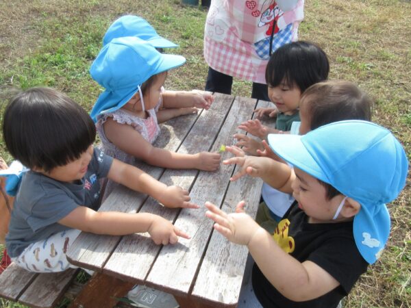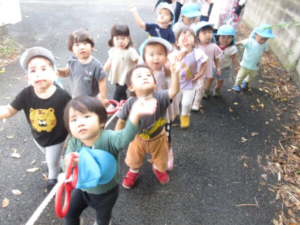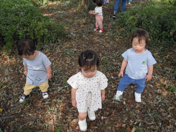 篠生神社の方まで散歩をしてきました。少し林の方にも入ってみると、木の実や葉っぱなど自然物にたくさん触れることができました。