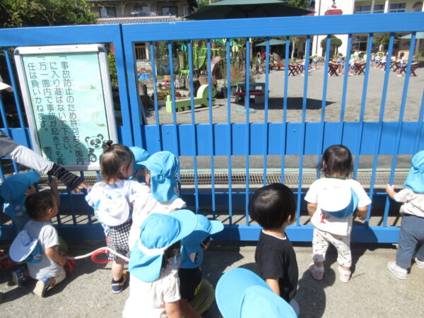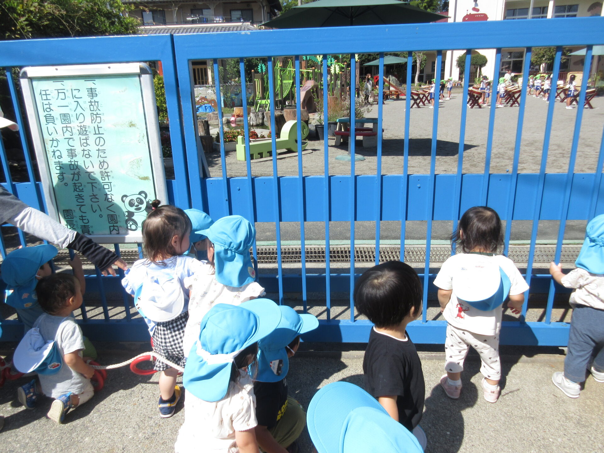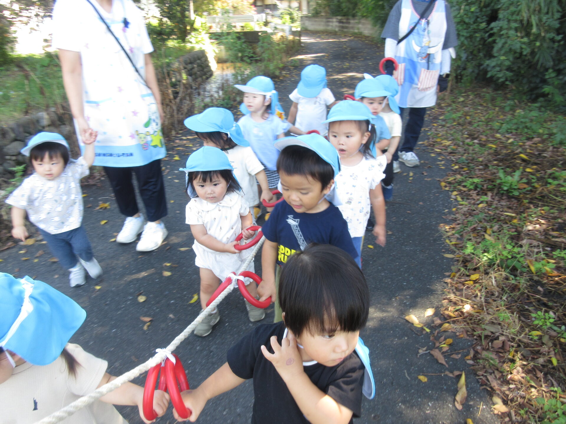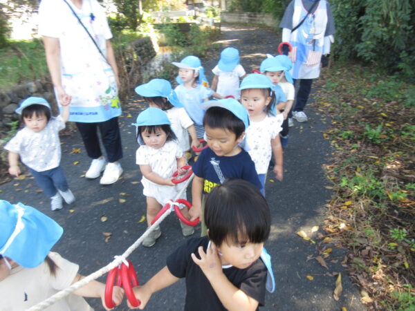 昼顔や彼岸花、トンボなど、秋を感じるものをたくさん発見して先生たちに教えてくれました。帰りには東光寺で挨拶をして、和太鼓の練習をしているふじ組さんを応援して帰ってきました!