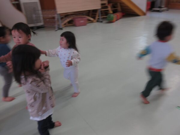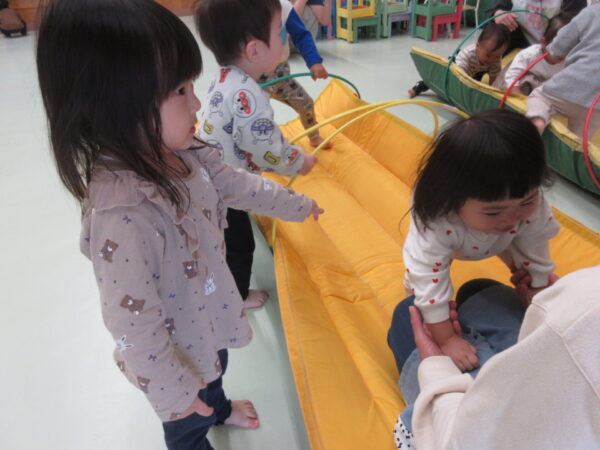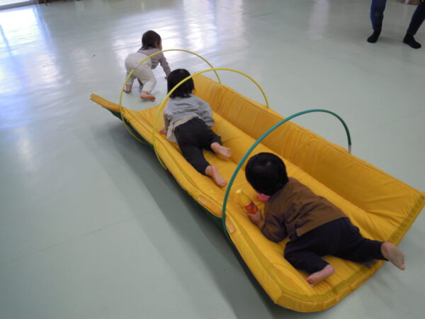 幼稚園のホールへ遊びに行きました。フラフープトンネルを用意してみると、前回やったことをよく覚えていたようで、何度もくぐってみる姿がありました。上手に反対側にぬけることができていましたよ。また、音楽が流れると膝を曲げ伸ばししてリズムにのったり、嬉しそうに手拍子をしていた子どもたちです。