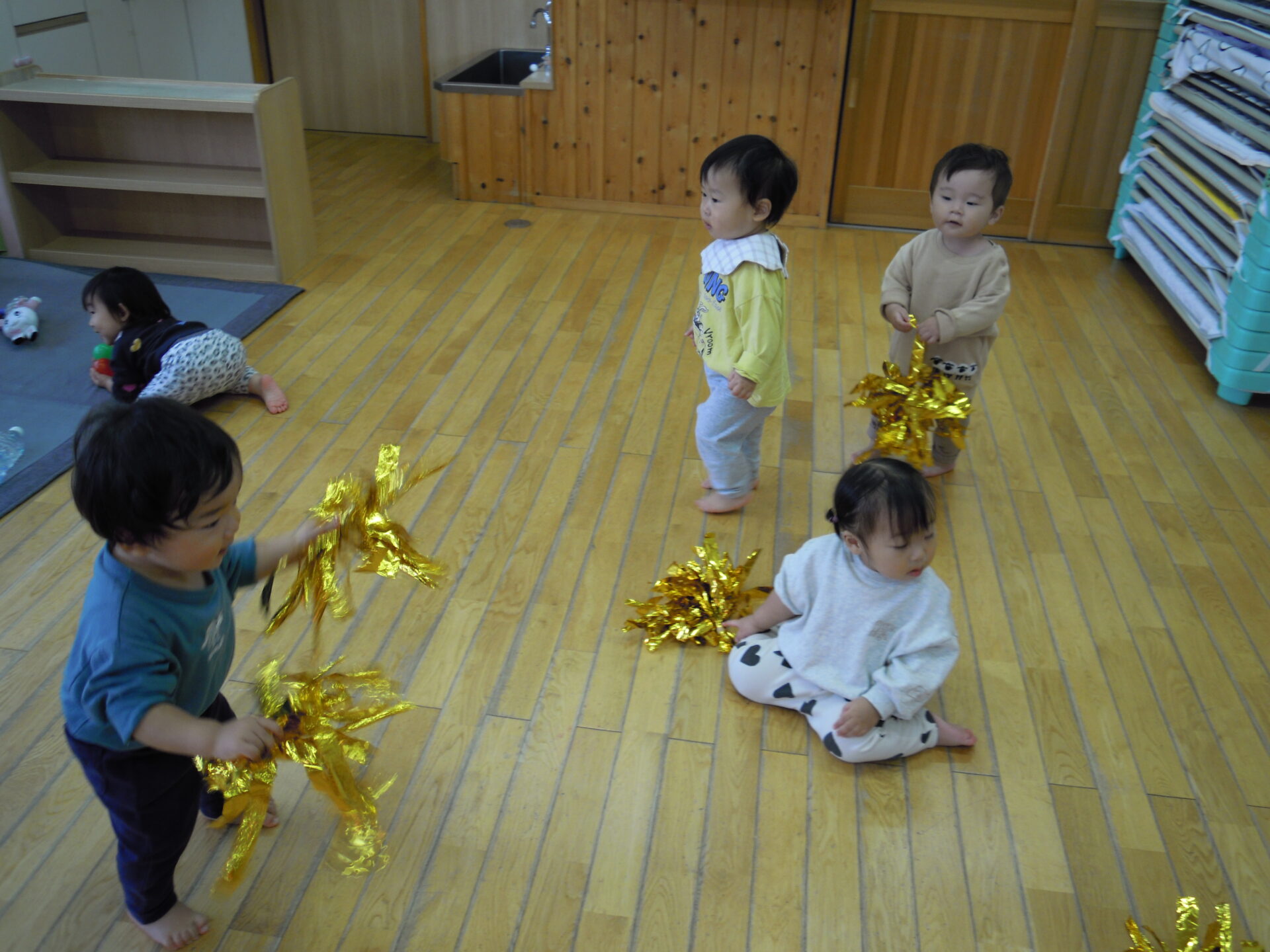 どんぐり2組さんのお部屋に行き、広いスペースでのびのびと体を動かす姿がありました。音楽に合わせて体をゆらしたり、保育者に追いかけられて勢いよく逃げたり…活発に動き回る姿が見られましたよ。2組さんのきらきらのポンポンをかしてもらうと、両手に持ったり、左右に振ったり、投げたりしながら楽しそうな様子でした。