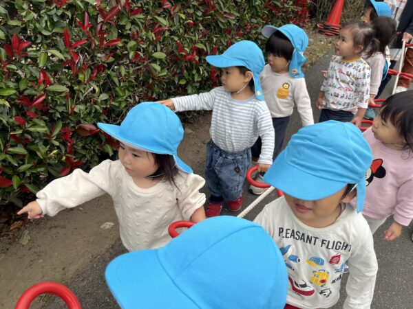 今日は幼稚園の近くの線路までお散歩をしました。初めての道に嬉しそうにする子どもたちの姿があり、どんぐりや薔薇、線路を見てお歌を歌ったりやりとりを楽しんだりして行ってくることができました!
