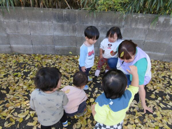 園の周りを散歩し、黄色い落ち葉がたくさん落ちている場所を見つけました。落ち葉を踏んでみてカサカサとする感触を楽しんだり、上からパラパラ~っと落ち葉を散らしてみたりしながら嬉しそうにしている姿がありました。