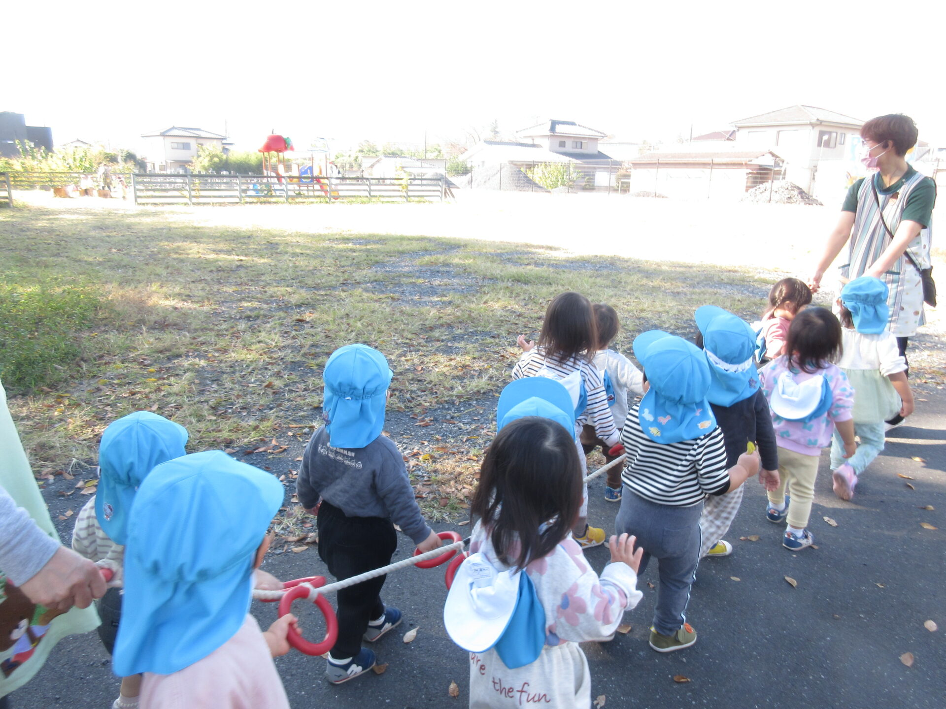 また、道中でははらっぱワールドにいたたまご組さんと、お散歩中のどんぐり1組さんのお友だちに会うことができ、ニコニコな笑顔が見られました!