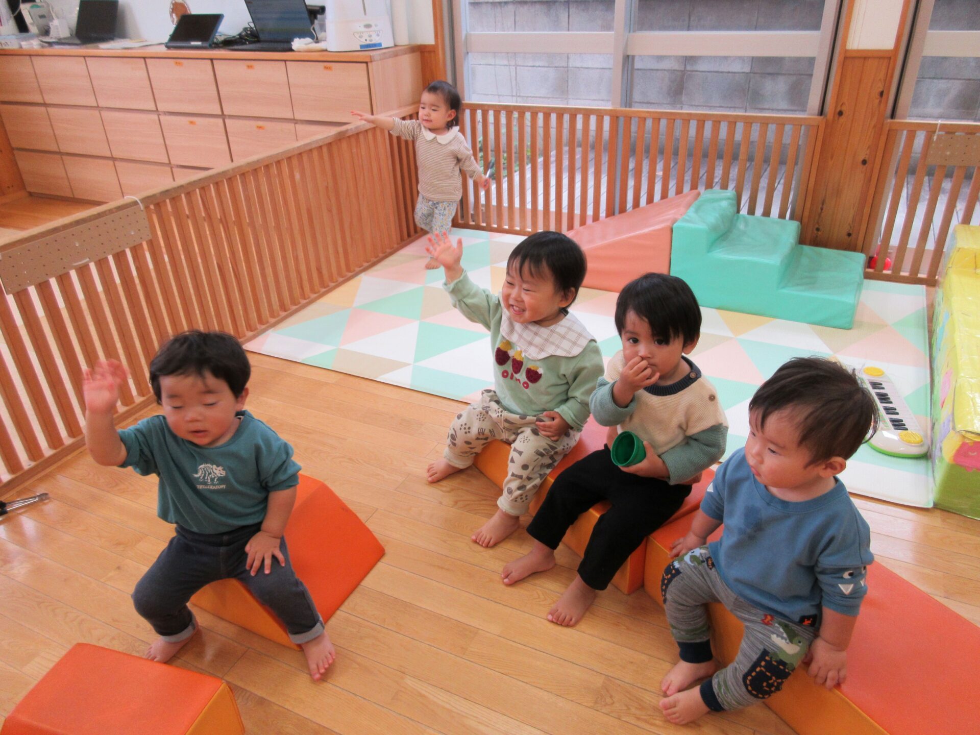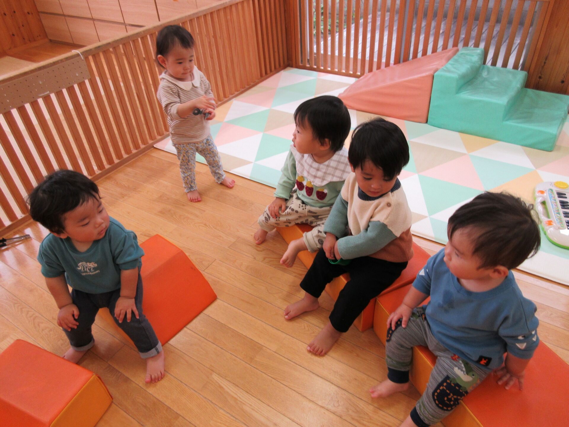 ソフトブロックを用意すると、上に座ったり、立ち上がったり、押しながら歩いたり、持ち上げたりするなどしていました。友だちの隣に座っている姿が微笑ましかったです。
