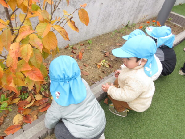 また、花壇のお花や色付いた葉っぱにも興味津々な子どもたちでした。
