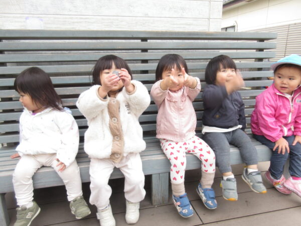 お散歩をしながら、ぷーさんのおうちへ遊びに行きました。建物の周りを探索して窓に映るお友だちや先生の姿を発見して喜ぶ場面や、色々な形の石を集めてお友だちと見せ合ったりと楽しそうにする姿が見られました!