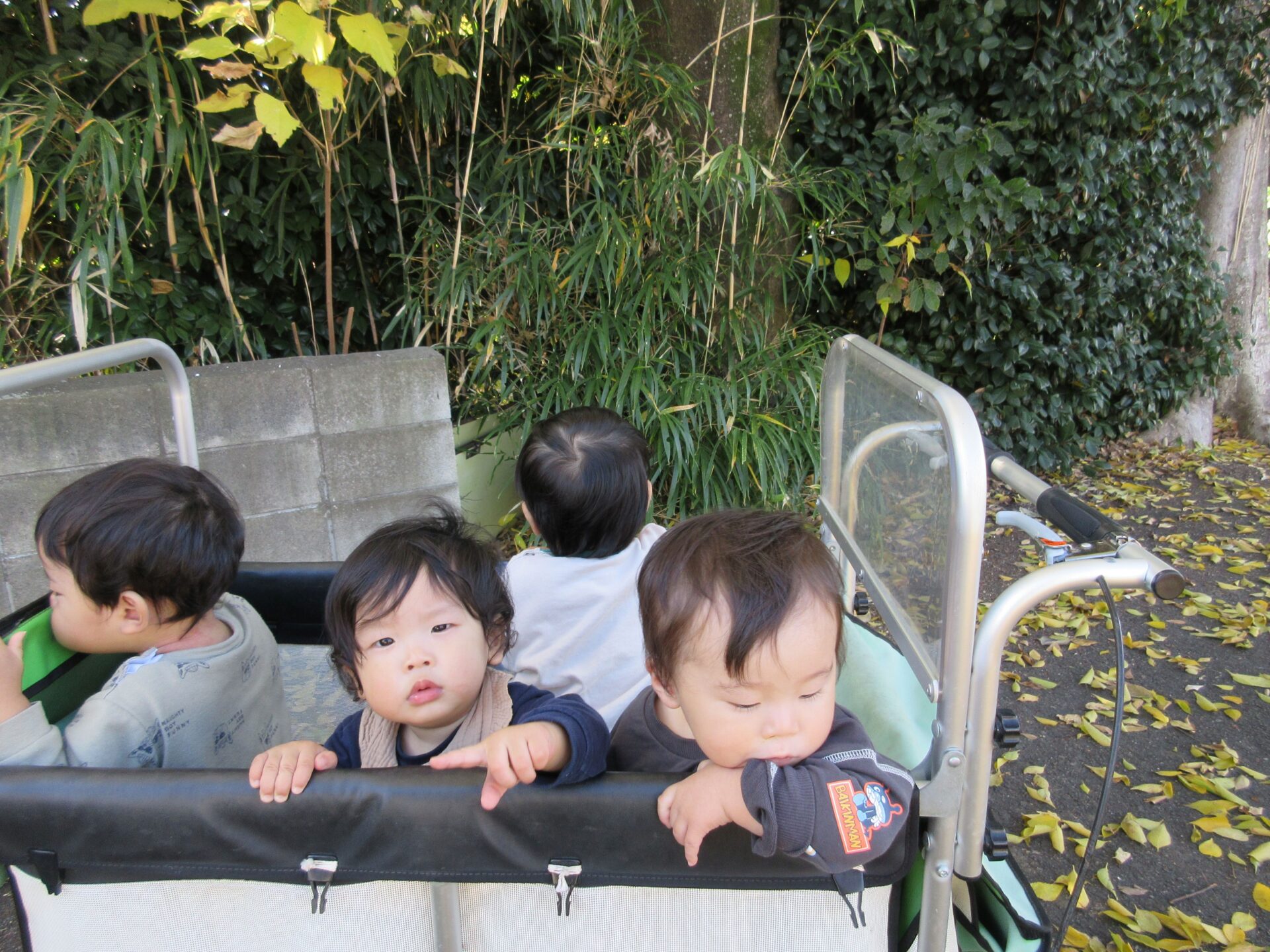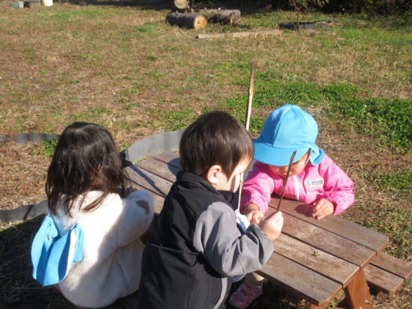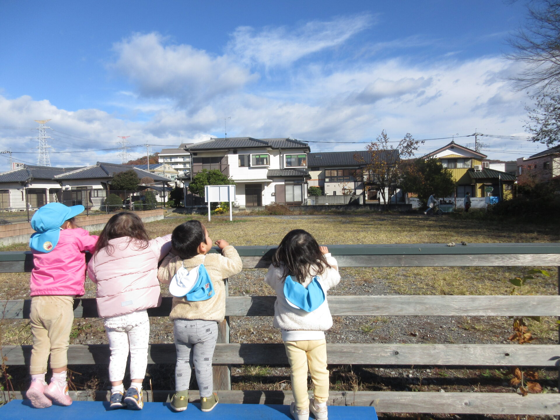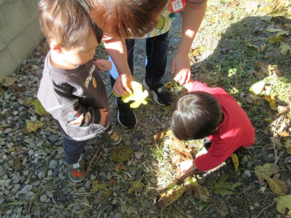 *1組 園の周りを散歩していると、大きな黄色い葉っぱを見つけました。手に持ってみたり、上から落としてみたり、足で踏んでみたりしながら喜んでいました。ちぎってみる姿もありましたよ。 *2組 はらっぱワールドに遊びに行きました。石集めや赤い実を見つけて喜ぶ姿や、朝顔のの蔓から種を見つけて楽しむ姿が見られました。 また、お散歩中のどんぐり1組さんを見つけると「やっほー!」と元気よく呼びかける可愛らしい場面も見られました!