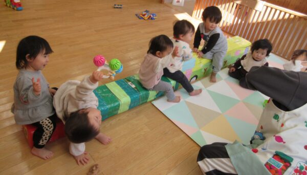 室内では、「バスごっこ」が盛り上がっていました。保育者の歌に合わせて体を揺らしたり、「右に曲がります」で体を大きく傾けるなど、たくさん体を動かしていました。