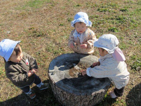 子育てガーデン広場へ遊びに行くと、石を両手に持って打ち鳴らし、音が鳴ることを面白がったり、遊具に何度も登ってすべり台に挑戦する姿が見られていました。