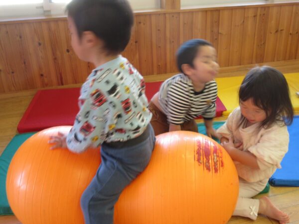 またバランスボールにお友だちと乗り、お馬さんに見立てたり、のりものに見立てたりして喜ぶ姿も見られました。
