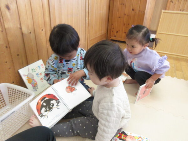 今日はお部屋でゆっくりと過ごしました。絵本コーナー、ボール遊びが盛り上がっており、先生を真似て読み聞かせをお友だちにしてみたり、一緒に同じ絵本をみて楽しさを共有している姿がありました。
