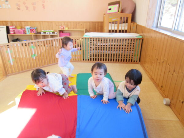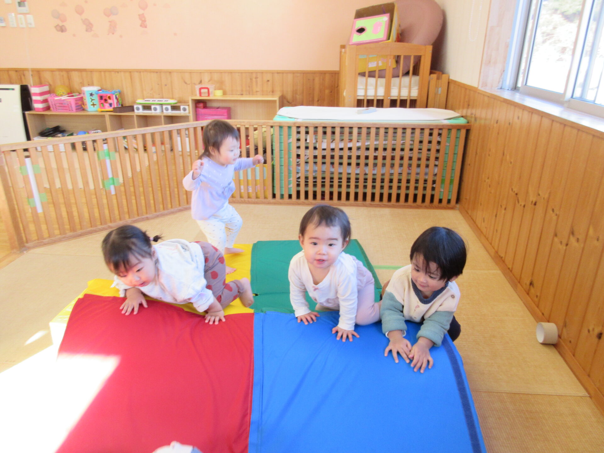 前回よく遊んでいたマットの坂を作ってみました。今日もとても嬉しそうによじ登ったり、しゅーっと滑り降りてみたり、横向きにころころと転がってみたり…と様々に遊んでいる姿がありました。