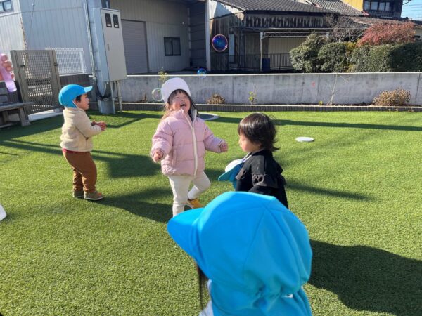 今日はぷーさんのおうちまでお散歩をして遊んできました。ボールを追いかけてサッカーのようにキックをして遊んだり、シャボン玉を追いかけてお友だちと走ったりと、たくさん身体を動かして過ごしました。