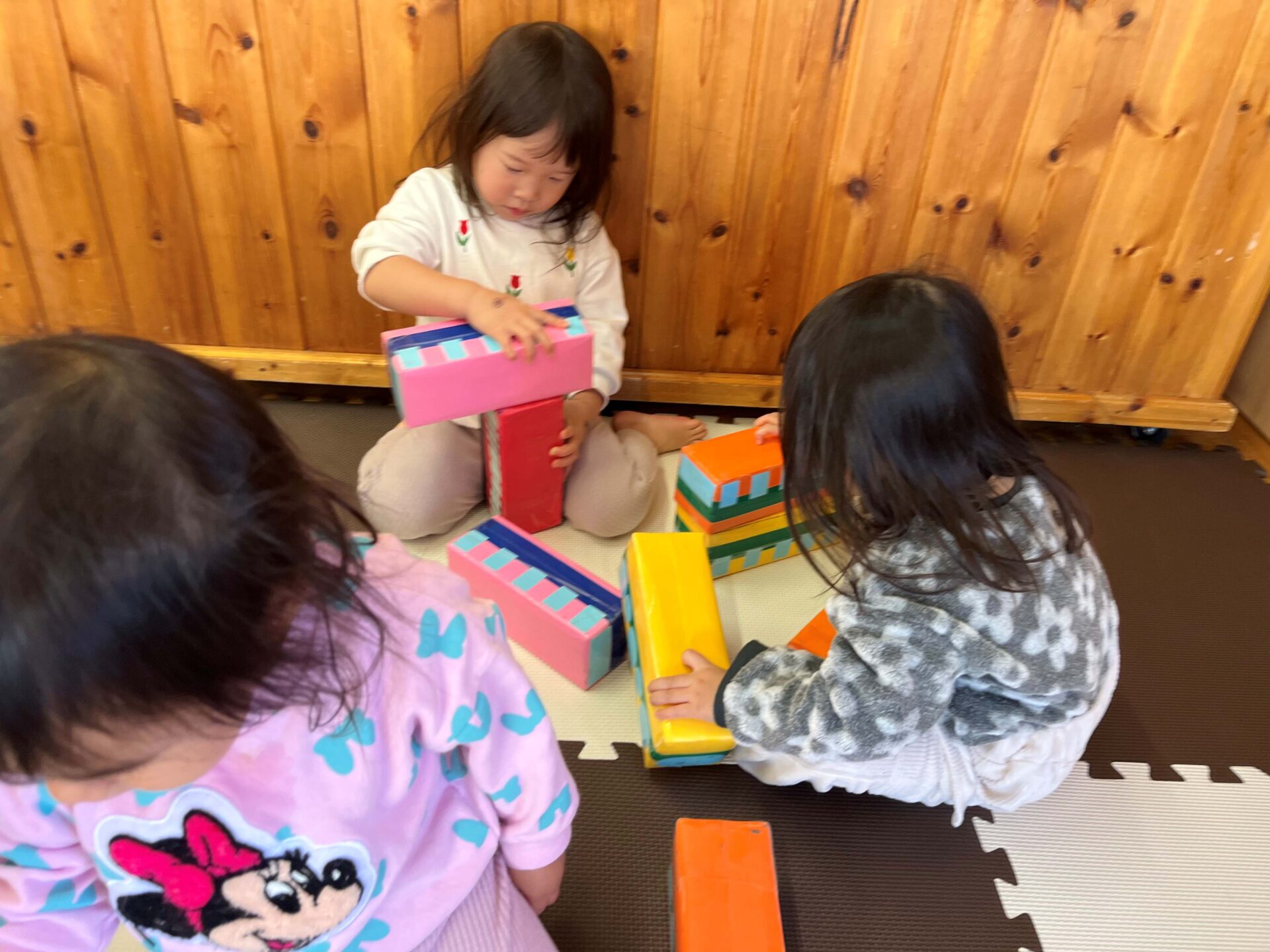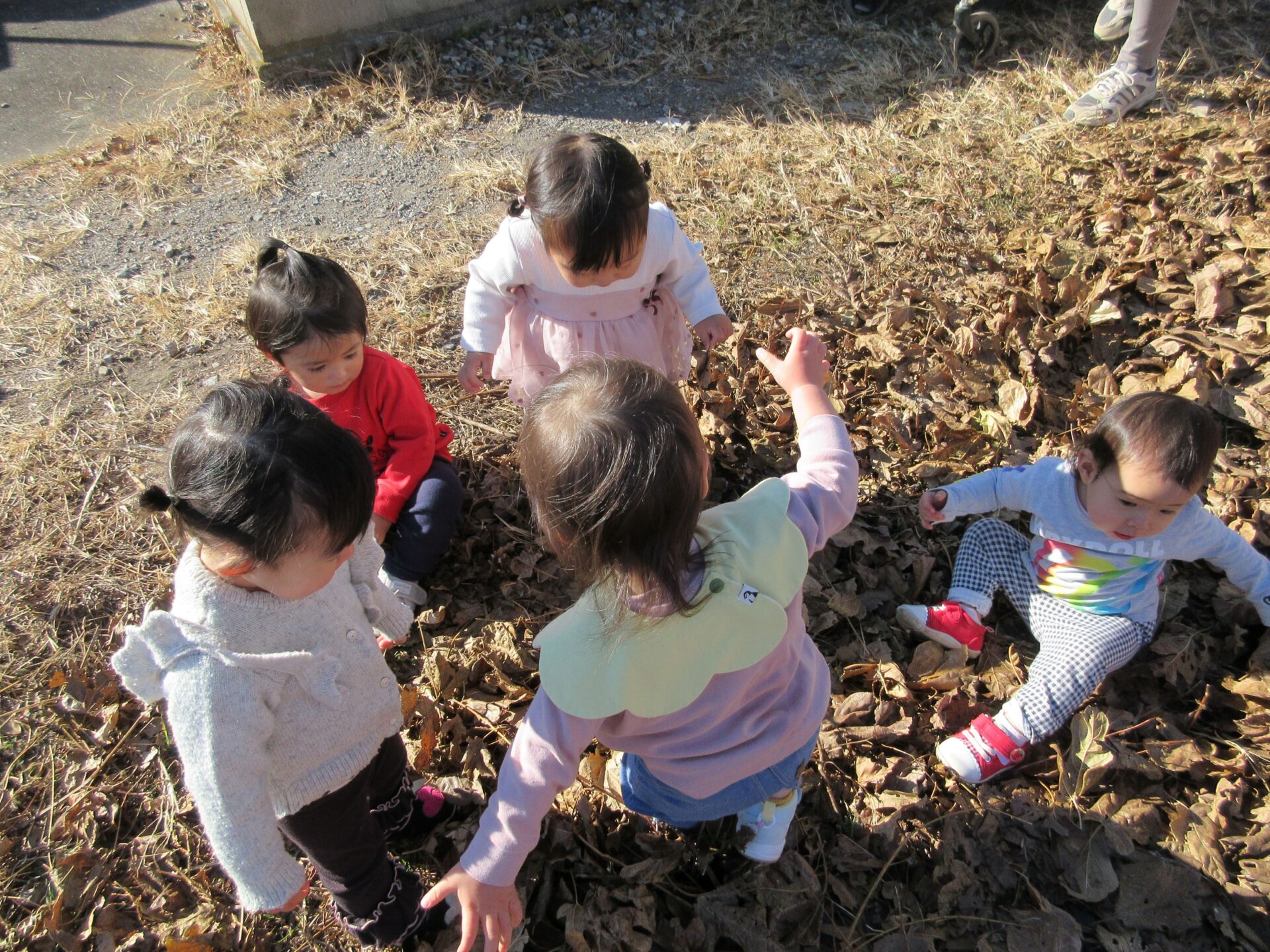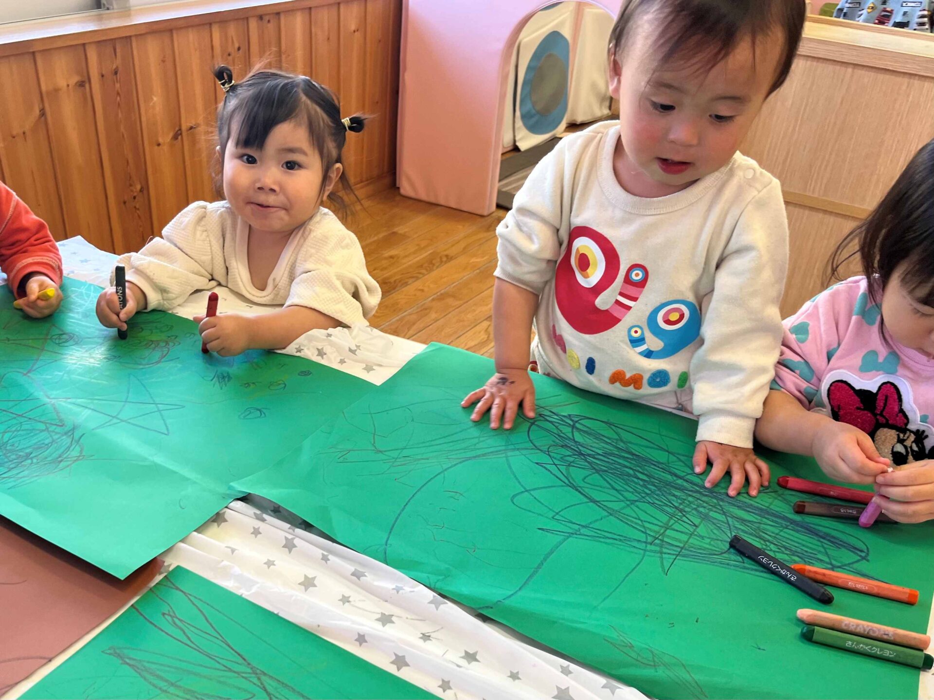 *1組 園の周りで、パリパリの大きな落ち葉をたくさん見つけました。中に入ってみたり、足で踏んでみたり、手に持ったり、上から散らしてみたり…様々に触れている様子がありました。 今の季節ならではの遊びですね。 *2組 今日はお部屋で遊びました。おままごと、のりものなどいつものコーナーに加えて、お絵描きコーナーで色画用紙にお絵描きをしました。同じ色だとはっきり色が見えないという発見もあり、夢中になる姿がありました♪