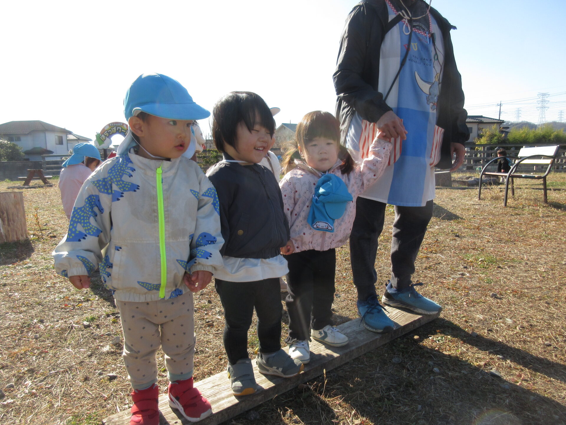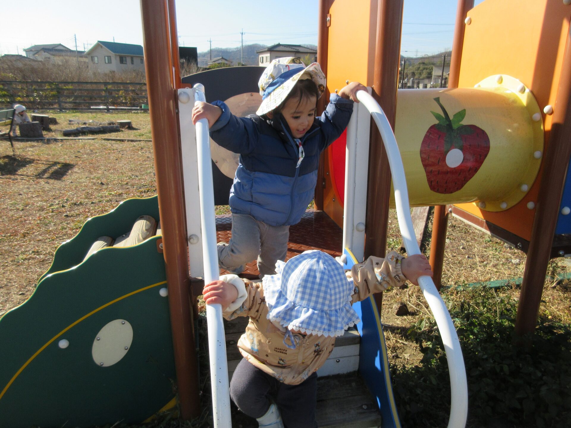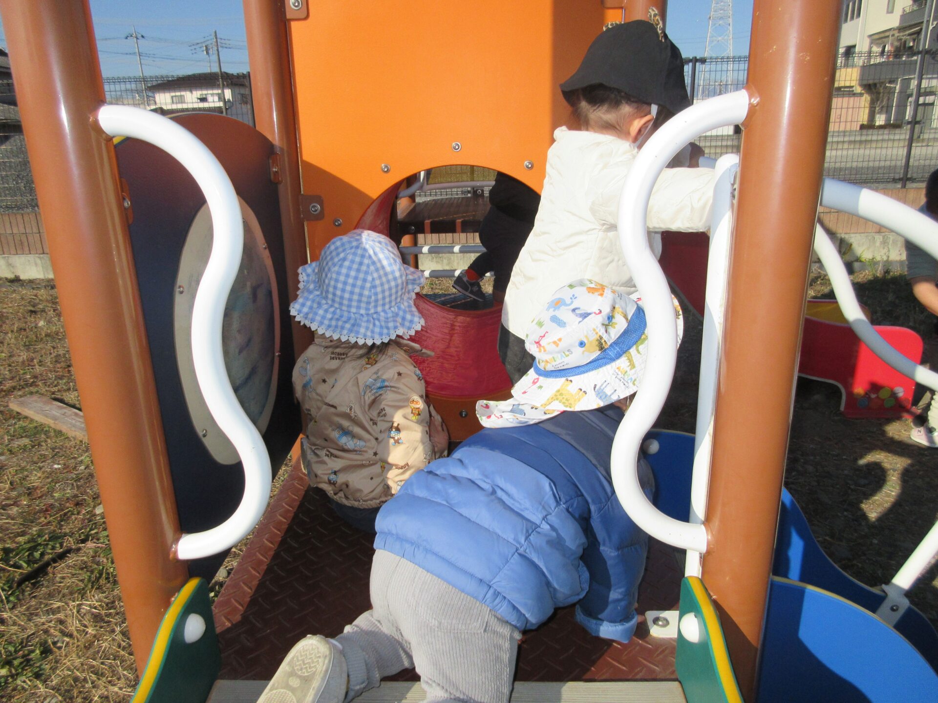 子育てガーデン広場で遊びました。遊具で遊ぶことをとても喜んでいて、一人で階段を登ったり、降りたり…すべり台にも挑戦しようとしたり…トンネルを何度もくぐったり…とたくさん体を使って遊ぶことができました。