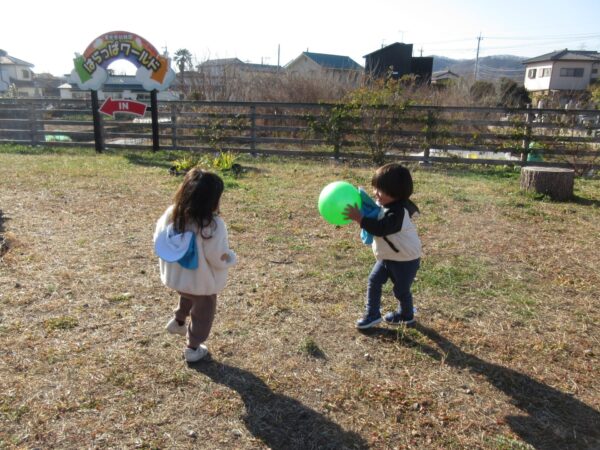 遊具だけでなくボール遊びも楽しみ、お友だちと一緒に追いかけたり、向かい合わせになって投げ合いっこをして笑い合う可愛らしい姿が見られました。