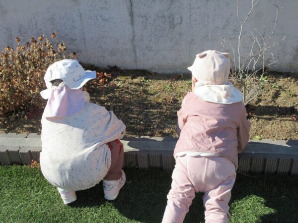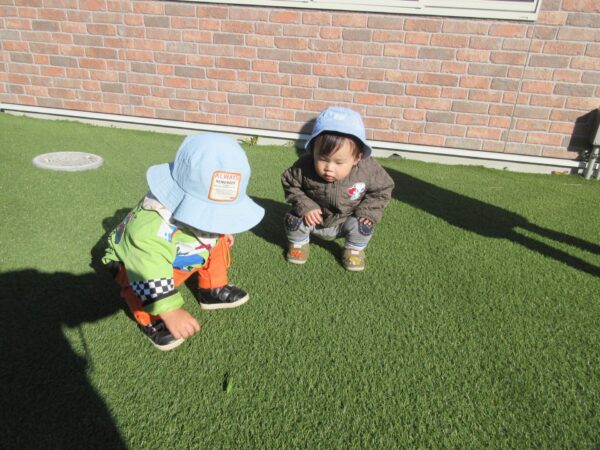 プーさんのお家の人工芝のところで遊びました。ぴょんぴょんと元気に跳ねるバッタを見つけ、興奮気味な子どもたち。「あ!あ!!」と指をさしながらバッタを追いかけたり、花壇のように逃げていくとじーっと見ている姿もありました。触ることができる友だちもいましたよ。また会えるといいね♪