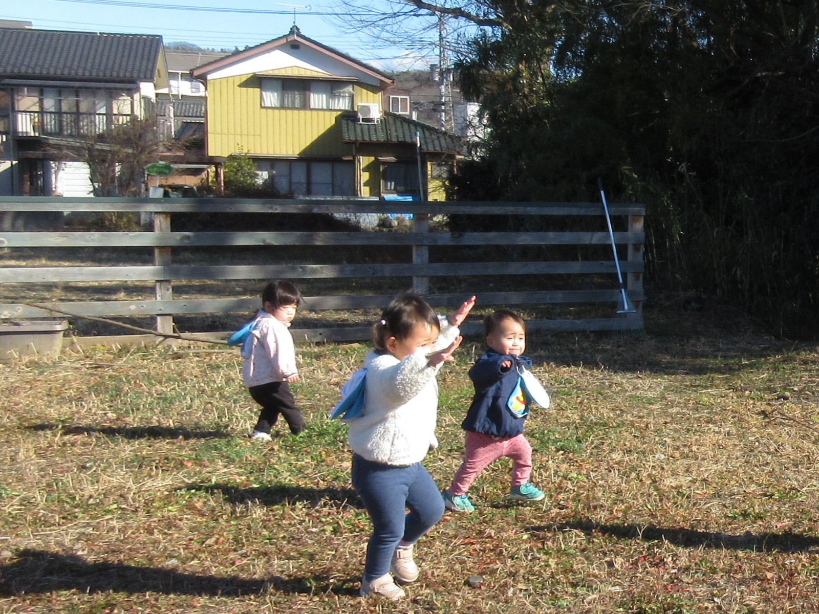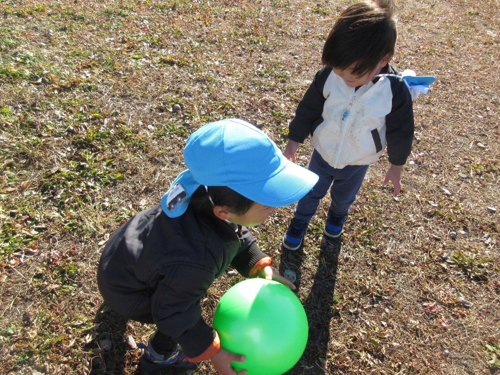 子育てガーデン広場へ遊びに行きました。シャボン玉やボールでたくさん遊び、お友だち、先生と一緒に身体を動かしました。また、ヘリコプターも見つけることができ、みんなで手を振って「ばいばい」をしました♪