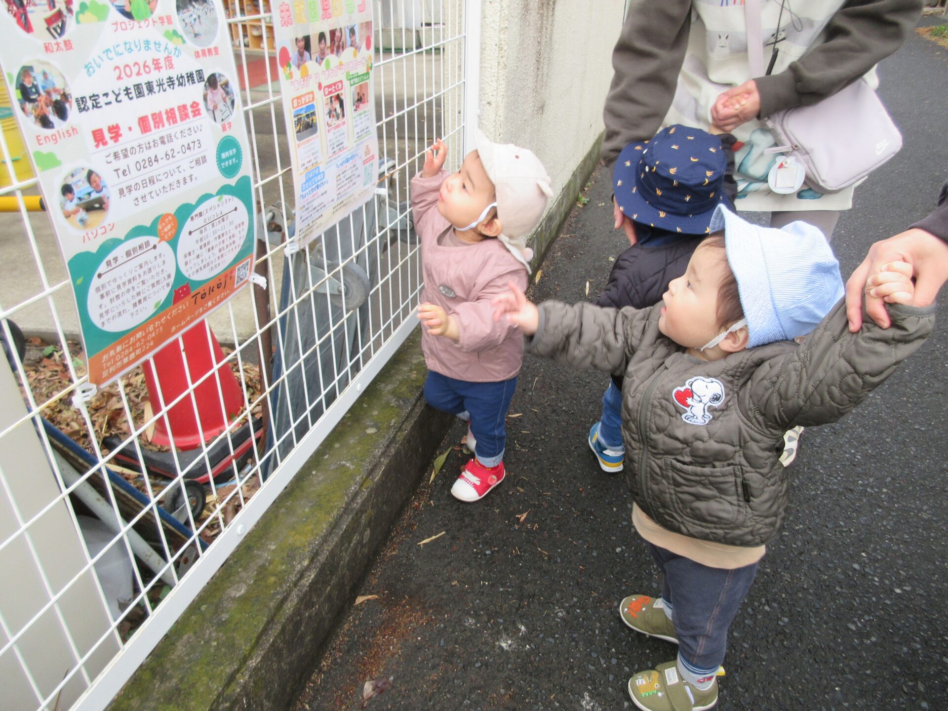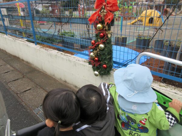 園の周りを散歩してきました。幼稚園の柵にクリスマスの飾りがあると「あ!!」と反応して指をさしたり、じーっと飾りを見ていました。