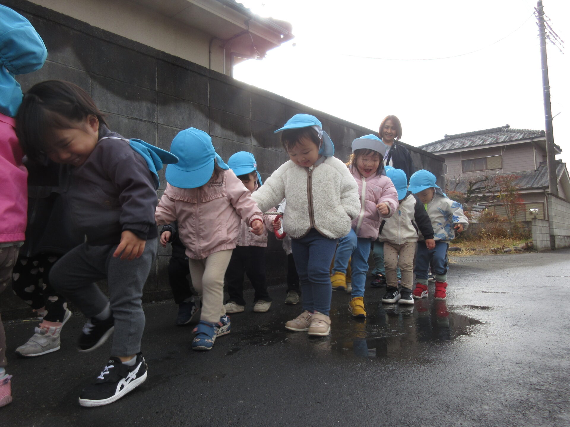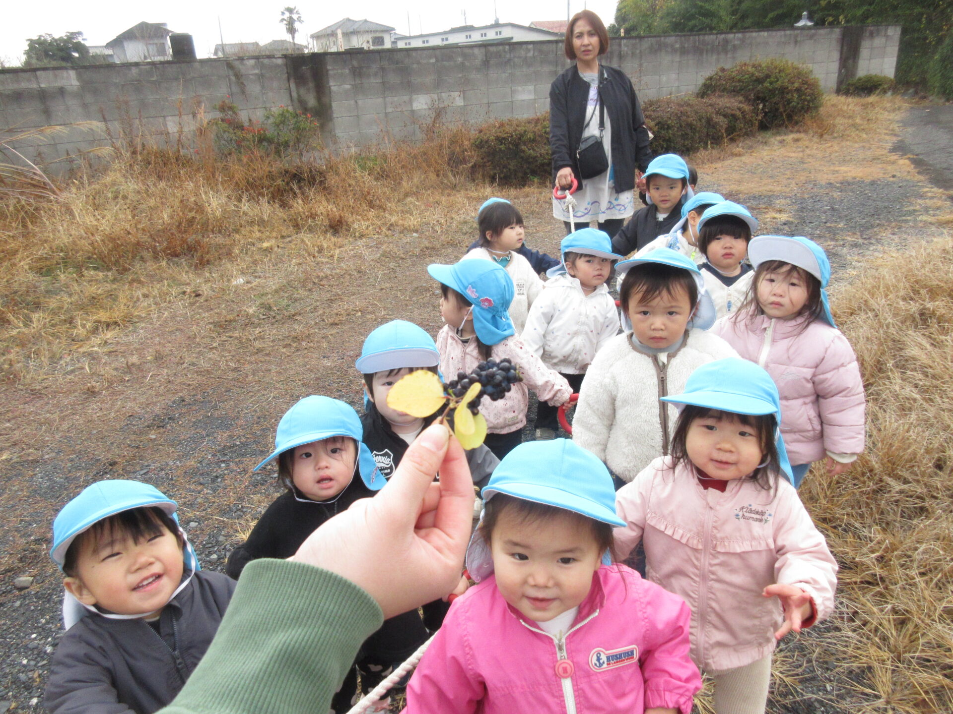今日は、園の周りをお散歩してきました。雨上がりの雰囲気にワクワクしながら歩いてみると、水たまりを見つけました。また、ぶどうのような実をみつけて、驚きながらも触れてみる可愛らしい姿が見られました♪