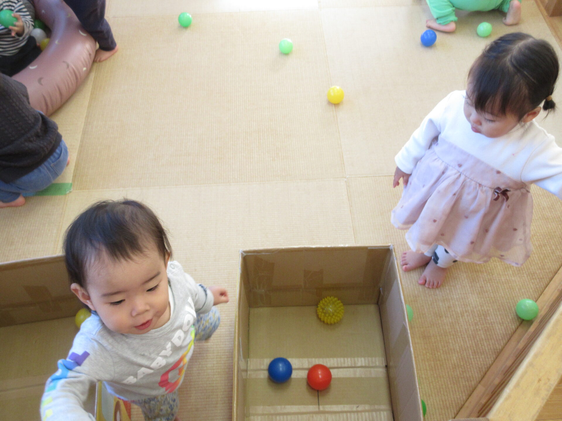 ボール遊びが盛り上がっている子どもたち。ボールプールの中に入ったり、段ボールにボールを集めて喜ぶ姿がありました。