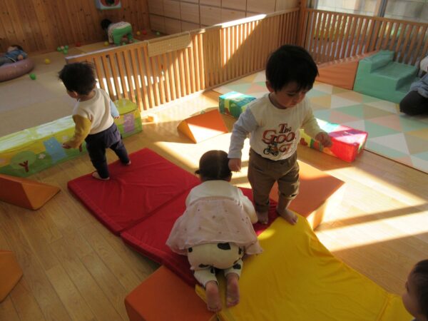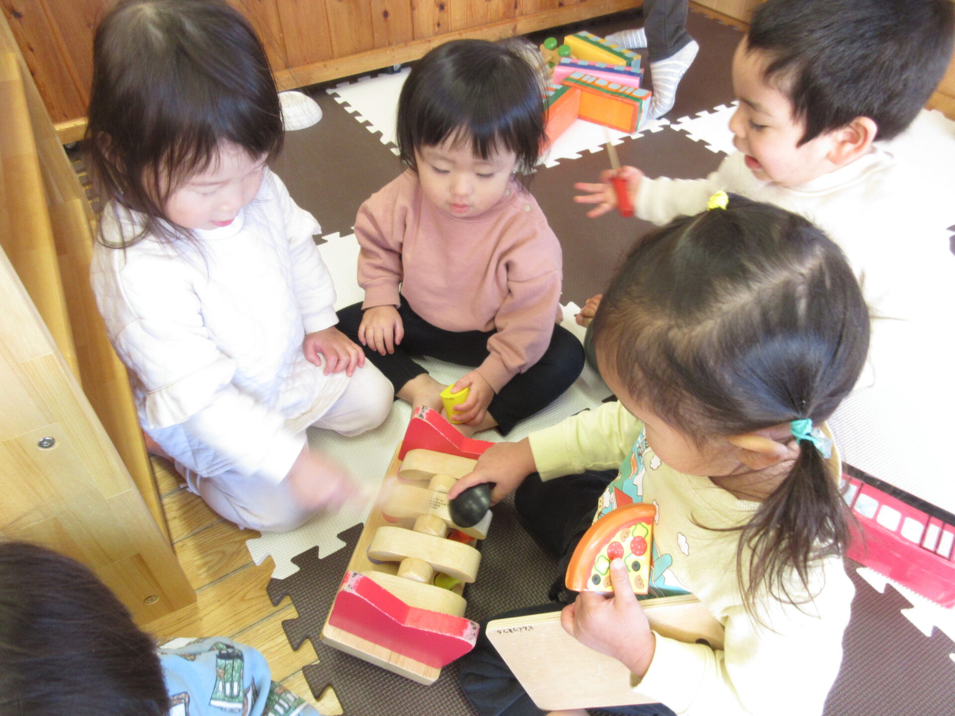 園に戻ると、積み木を重ねたり、木のおもちゃをみんなで囲んで楽しむ姿が見られましたよ。