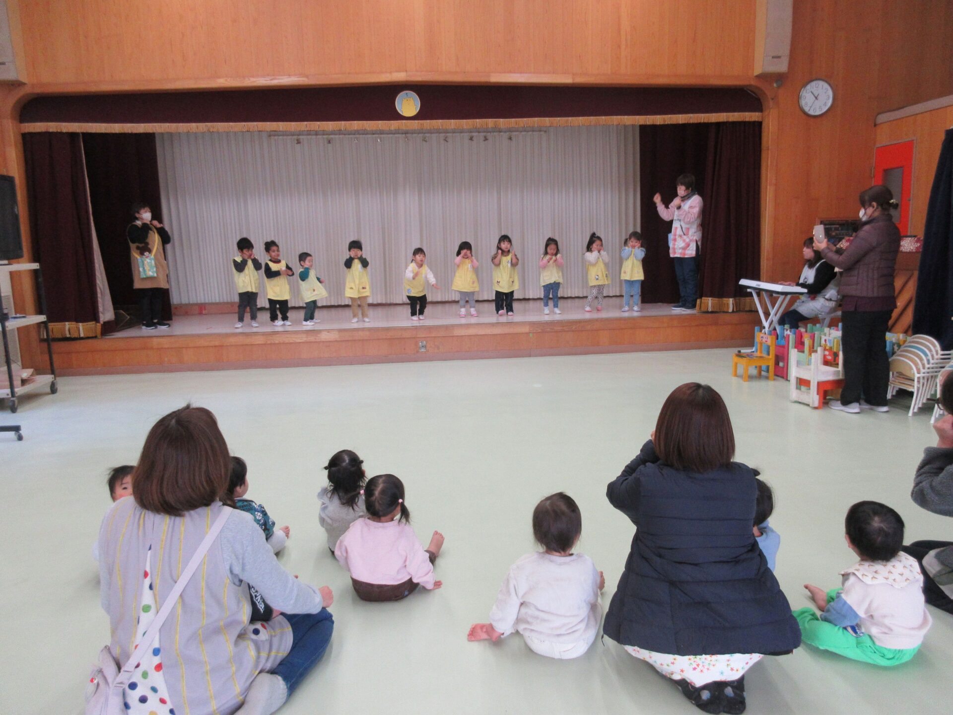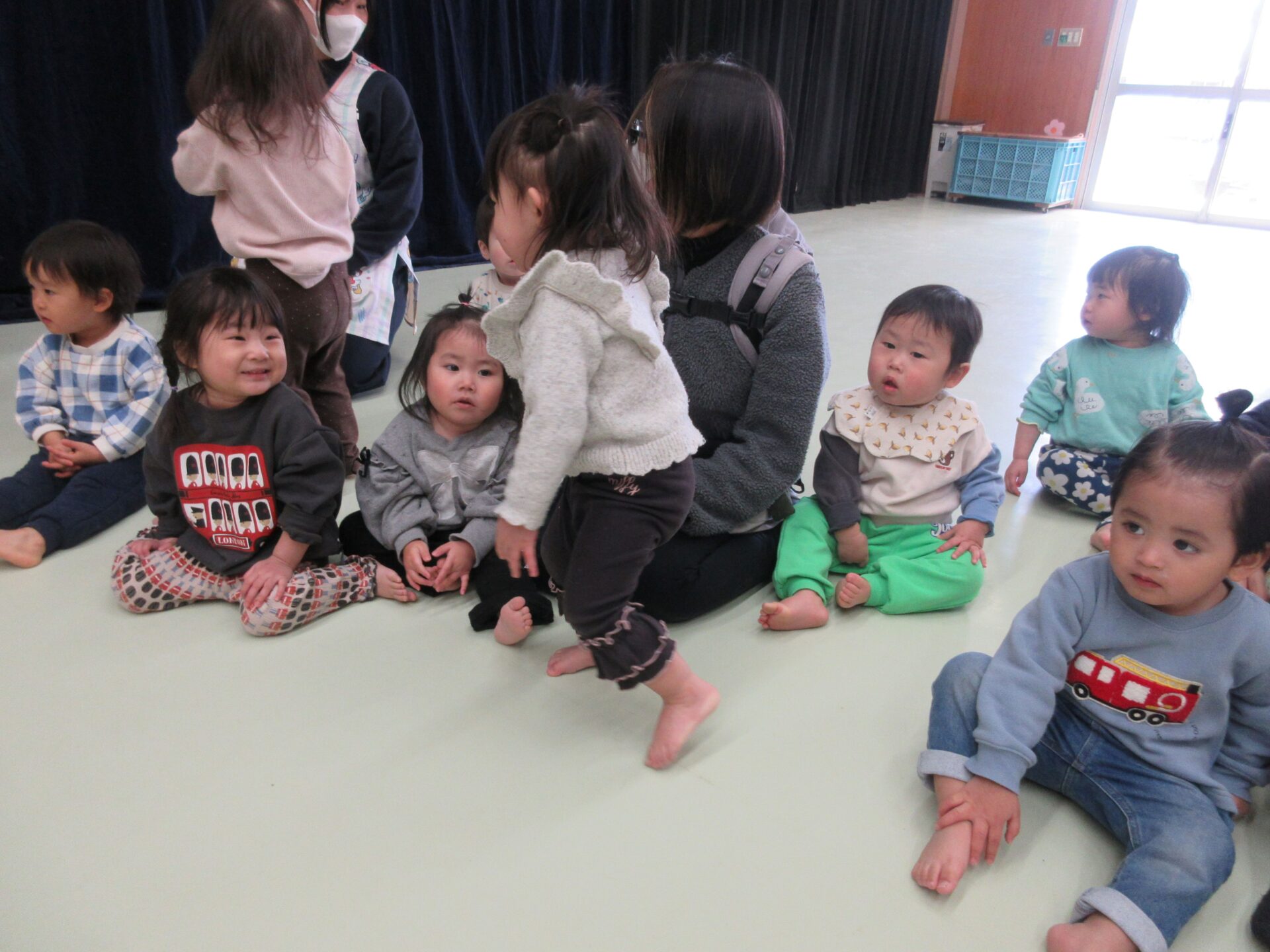 昨日に続きホールへ遊びに行きました。昨日行ったことをよく覚えていたお友だちは、嬉しそうにホールへ入っていく様子がありました。音楽が流れると「わ~!」と嬉しそうに反応して踊ったり、手拍子をしたり歌を口づさむような姿がありました。