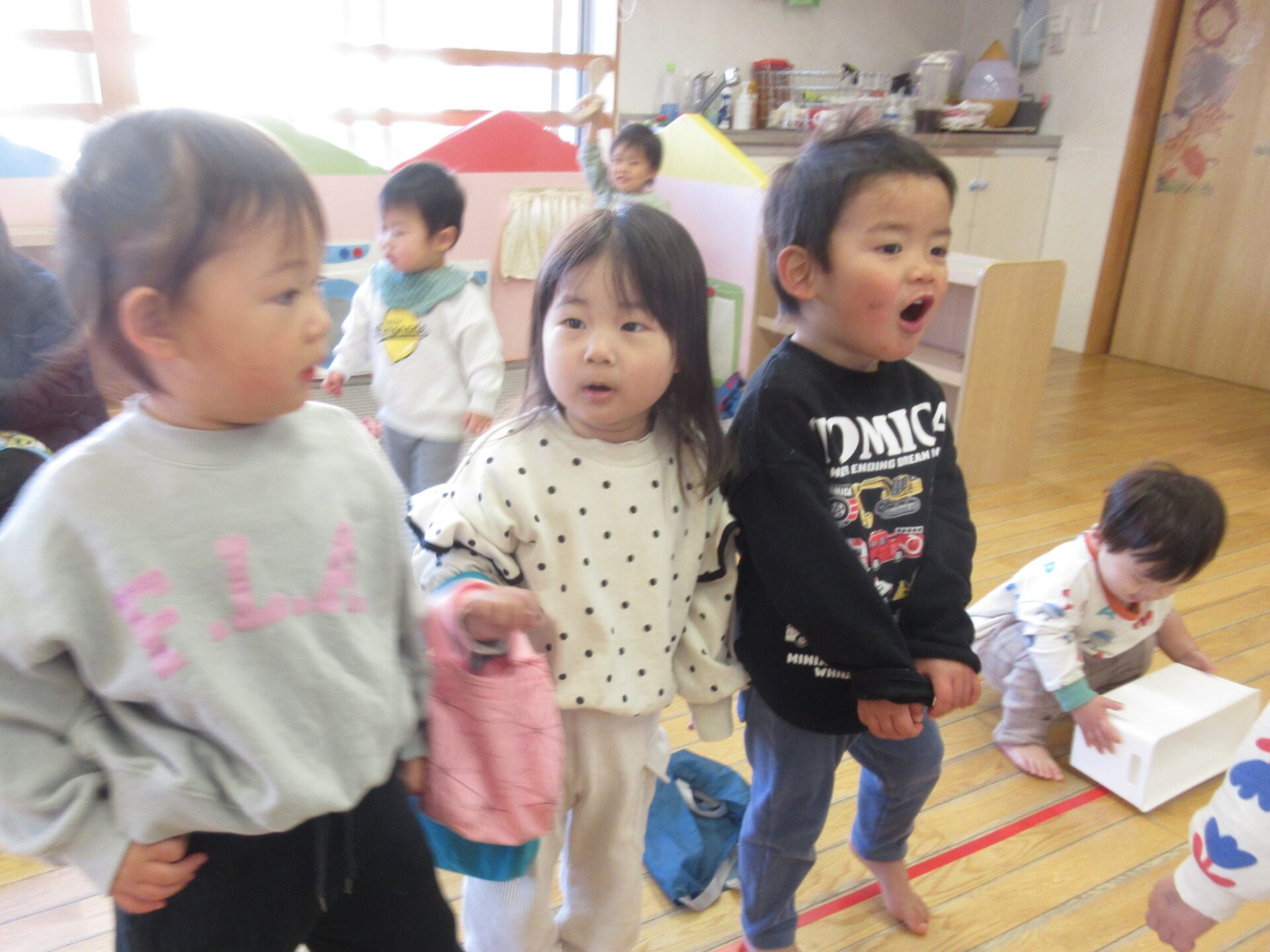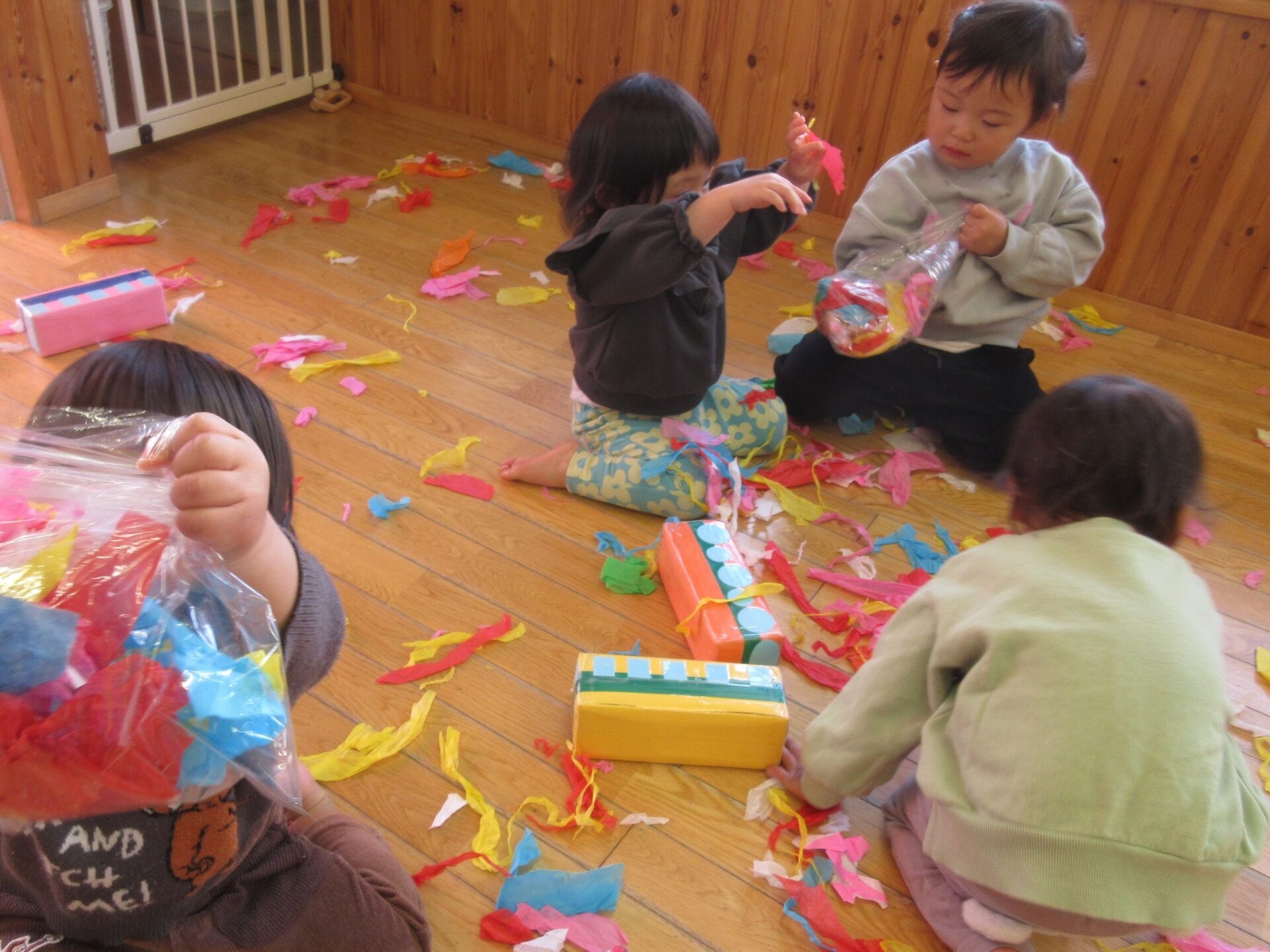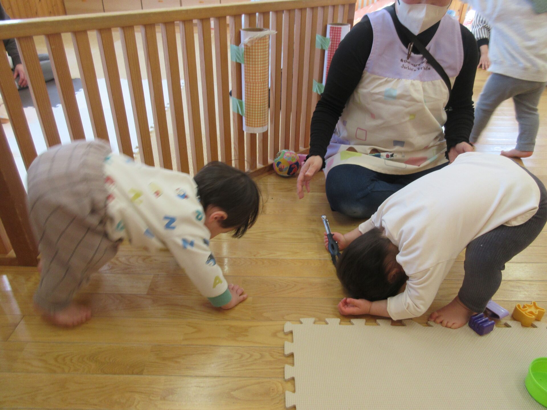 *1組 室内で過ごしました。四つん這いの体勢になって、反対側をのぞいている姿がありました。友だちと同じような体勢になってみたり、友だちの顔をのぞきこんでみたり、と微笑ましい姿もありました。 *2組 今日はお部屋でお花紙遊びをしたり、絵本や歌に合わせて体を動かしたりして遊びました。お花紙遊びでは、カラー袋にお花紙を集めて外から見てみると「色がちがう!」という発見がありました! また、きらきらぼしをみんなで並んで歌う可愛らしい姿もありましたよ。