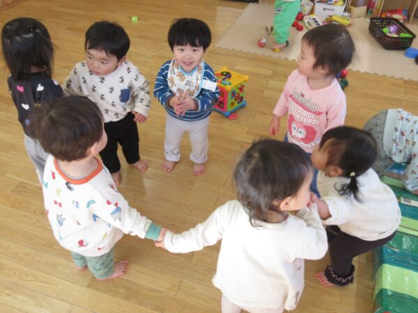 お部屋でボール遊びをして過ごしました。ボール投げからボールプール遊びへと広がり、先生の真似をしてボールを投げる可愛らしい姿が見られました。また、先生やお友だちと手を繋いでお散歩ごっこもしました!