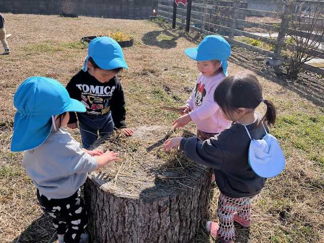 今日は子育てガーデン広場へ遊びに行きました。木の板をお友だちと一緒に動かしてアスレチックをつくって渡ったり、ベンチにしたり、切り株に草花を集めてみんなでお料理を楽しむ姿が見られました。