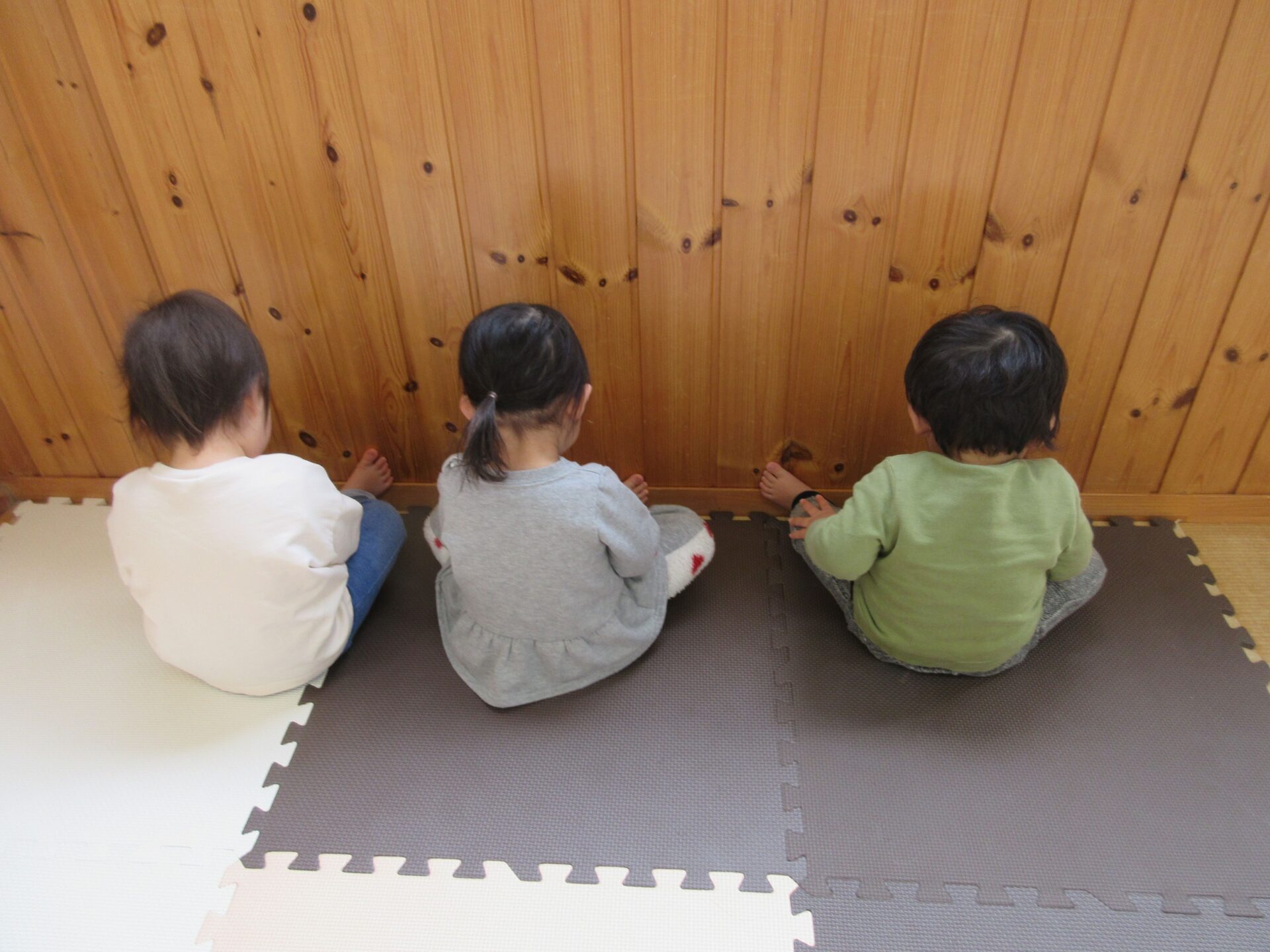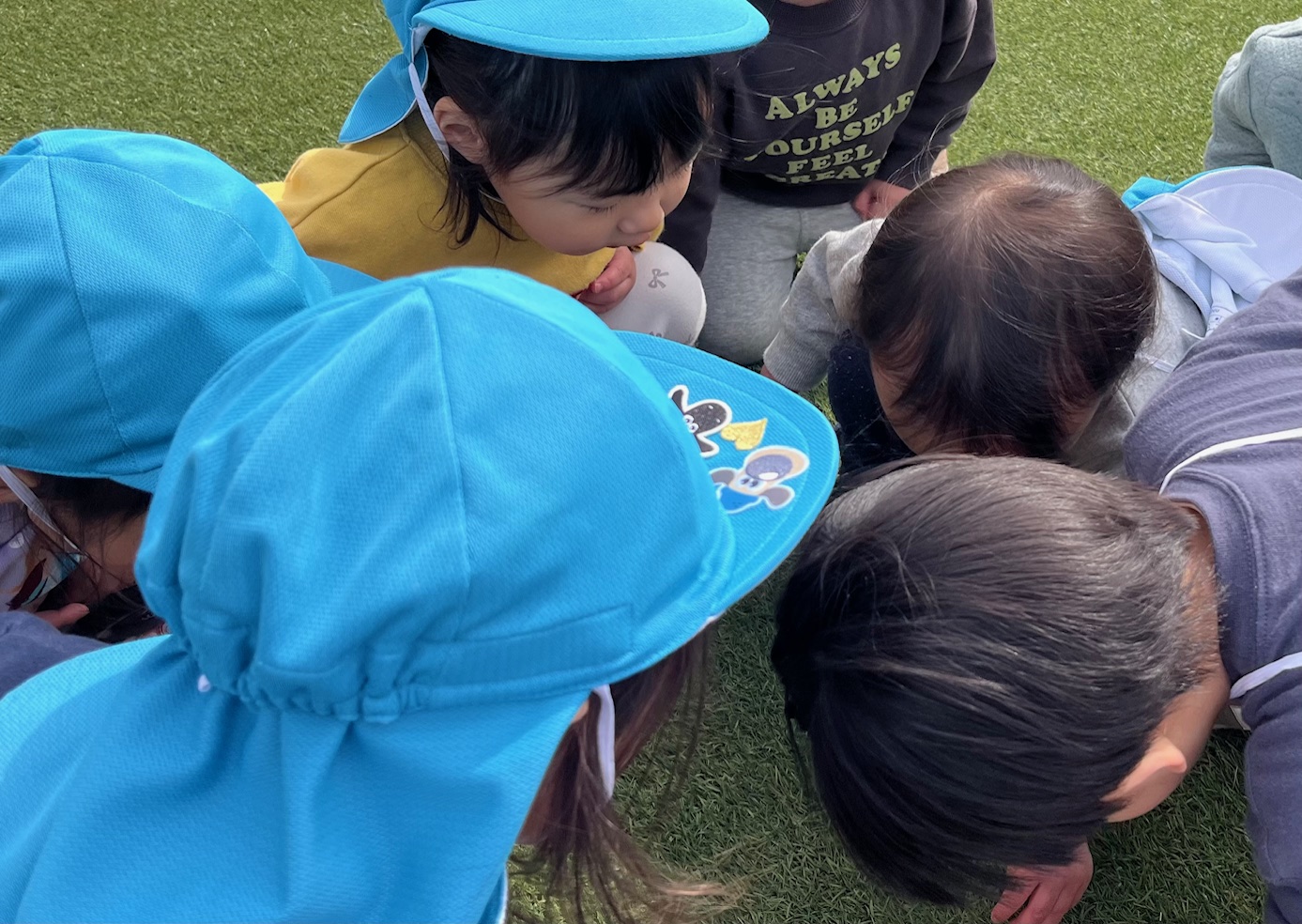 *1組 壁に向かって座り込み、何やら楽しそうな姿がありました。のぞいてみると、ブロックを足の間に立てたり、くるくる回るおもちゃを足の間において回そうとしていました。友だちと隣で、同じような体勢になることが嬉しかったようです。 *2組 ぷーさんのおうちへ遊びに行きました。建物の周りを走ったり、人工芝の部分では動物になりきって楽しんだり、ハイハイレースをして喜ぶ姿がありました。また、花壇ではアリさんを見つけて大盛り上がりでした。