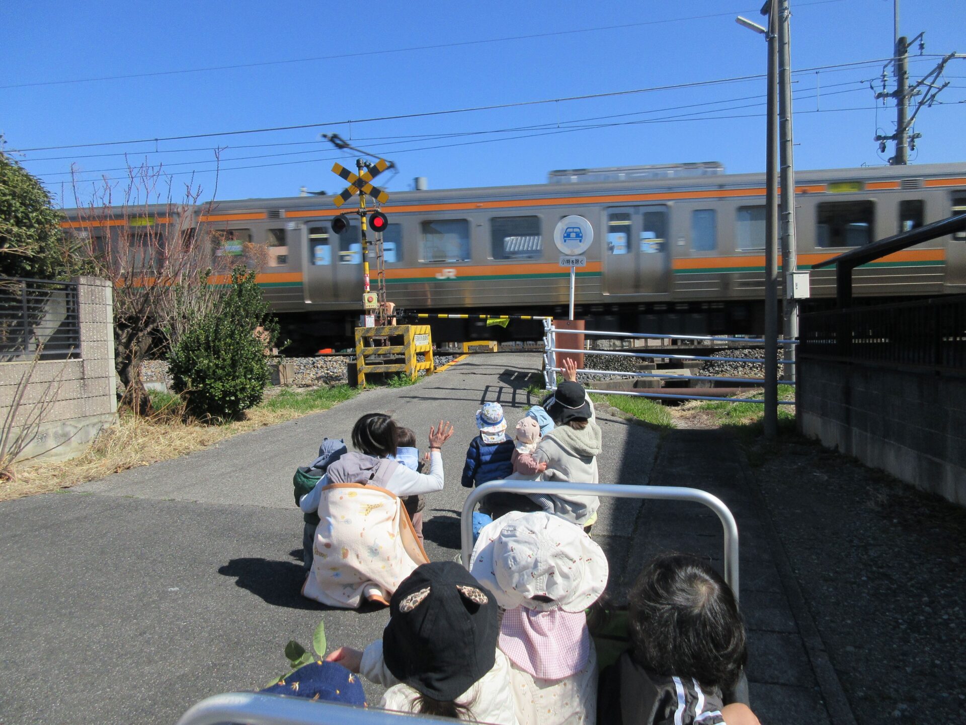 電車の方面まで散歩に行ってきました。ちょうど電車が通るところも見ることができ、嬉しそうな子どもたちでした。「ばいばーい!」と手を振ったり、「でんしゃ」と教えてくれる姿もありました。