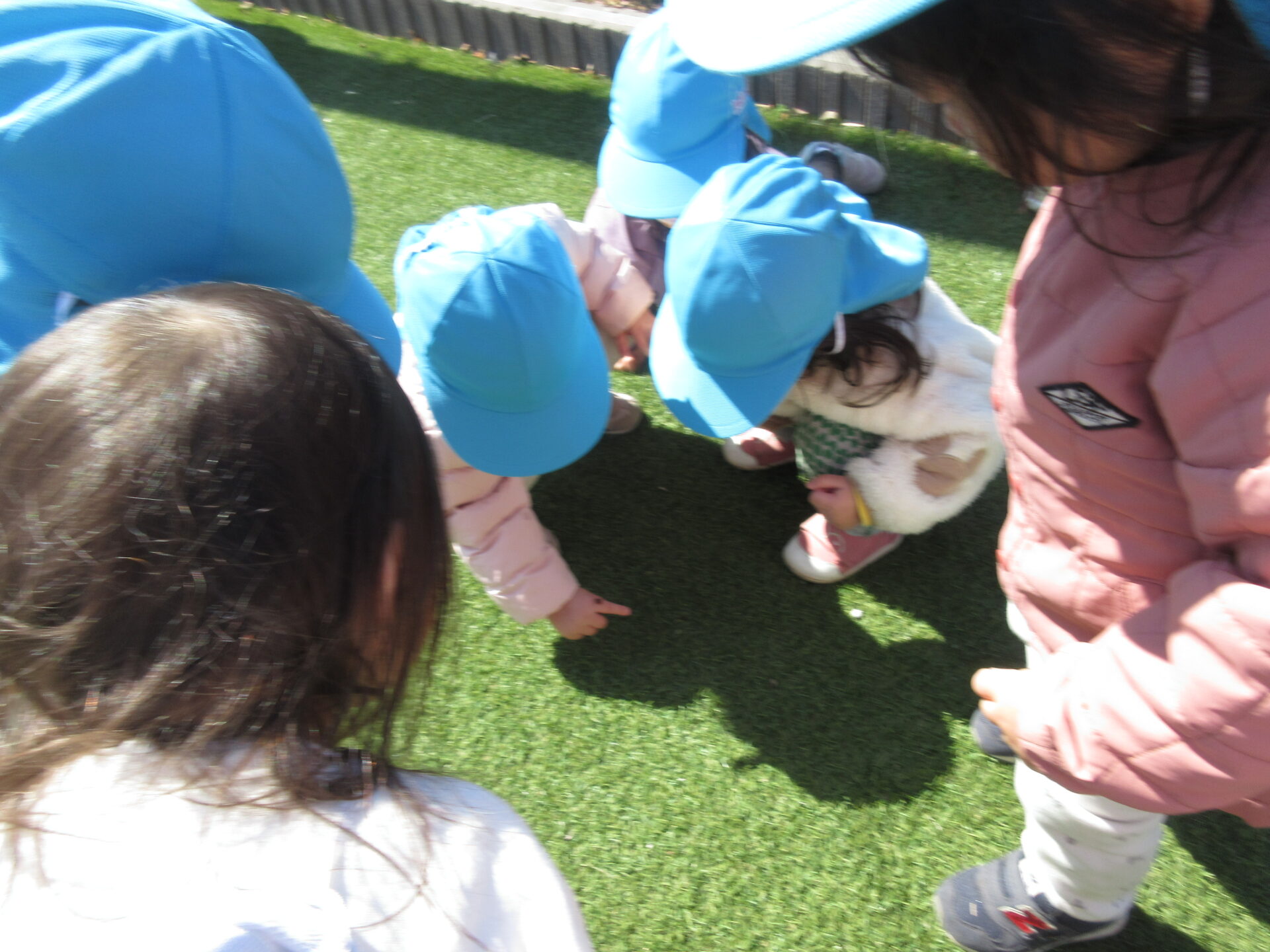 少し経つと、テントウムシも見つけて囲んで観察をしていました。お友だちの肩に止まると驚きと嬉しさで大盛り上がりの子どもたちでした。