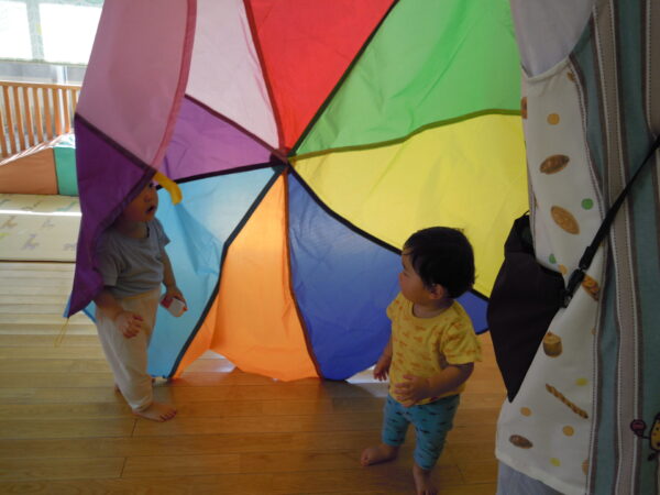 室内ではパラバルーンを出してみると、色鮮やかなバルーンに興味を持って近づいたり、中に入ってみたりしながら嬉しそうにしている姿がありました。