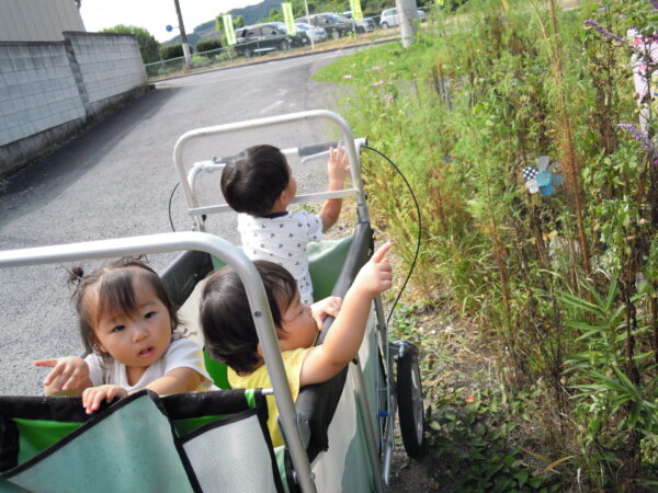 散歩では、ヒガンバナやコスモスなどを見つけ、指をさしたりつんつんと触ってみたりしました。様々な自然に触れることができましたよ。