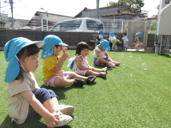 ぷーさんのおうちへ遊びに行きました。シャボン玉やかけっこ、虫探しをして嬉しそうな子どもたちでした。また、みんなで並んでシャボン玉キャッチを楽しんだり、ベンチに自ら座ってみたりと、お友だちの真似っこをして遊ぶ姿も増えました!