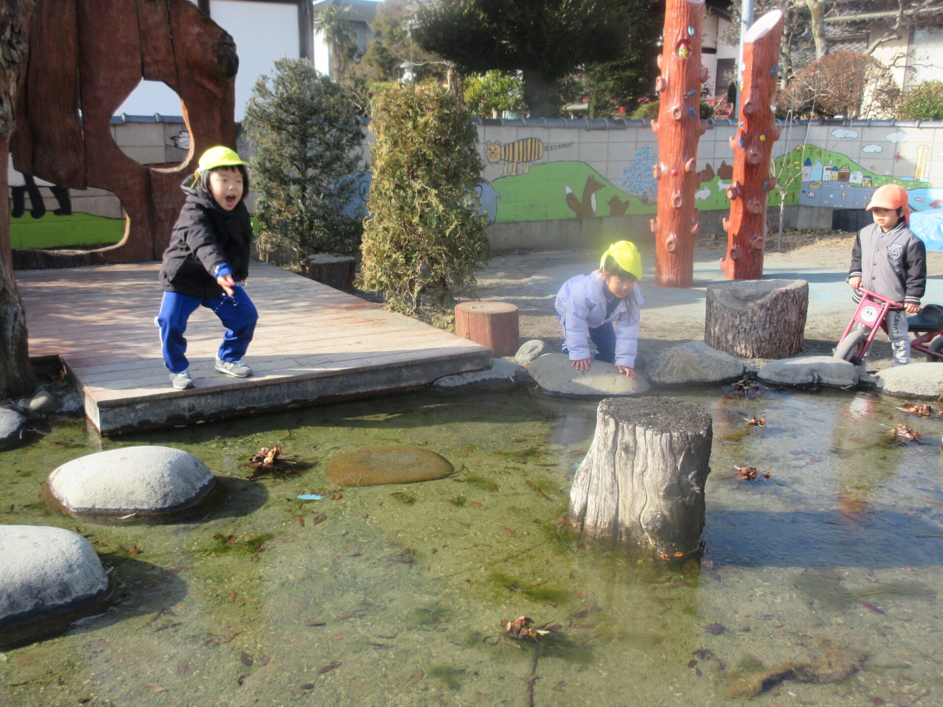 池の水が凍っていることに気が付き、割ってみたり、氷の上を歩いてスケートみたいと表現したり、冷たさを友だちと共有して喜ぶ姿も多く見られました。