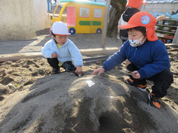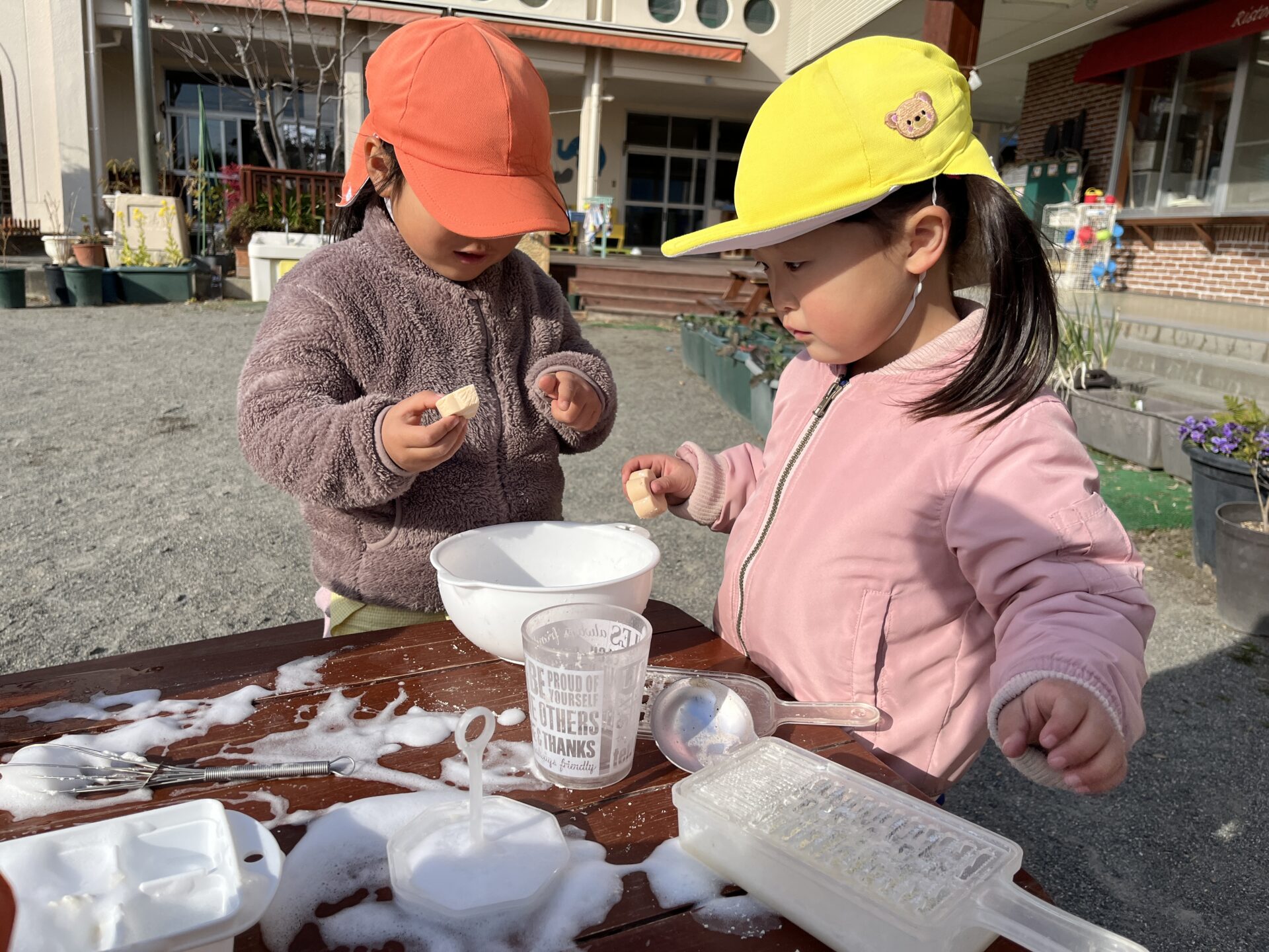 午後には泡遊びも盛り上がり、石鹸をおろし金で擦ると豆乳に見立て、水を加えて泡を増やし、外に置いておけば明日の朝凍っているかもね!と予想していました。明日どんな発見が見られるか楽しみです。