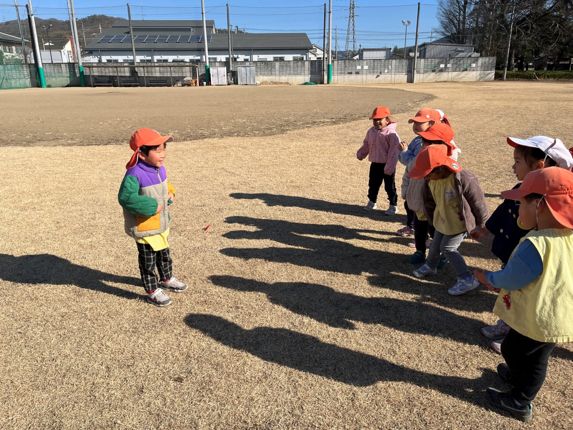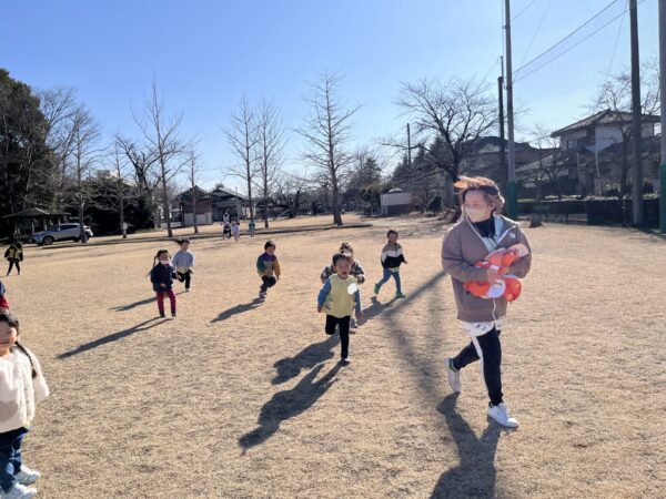 篠生神社のグランドに遊びに行きました。 広い芝生の上で寝転がったり、追いかけっこをしたりと友だちや保育者と一緒に体を動かして遊ぶことを楽しみました。遊びを何度か経験していくうちに鬼になったときにも自分なりの言葉で表現して楽しむ姿も多く、驚きました。